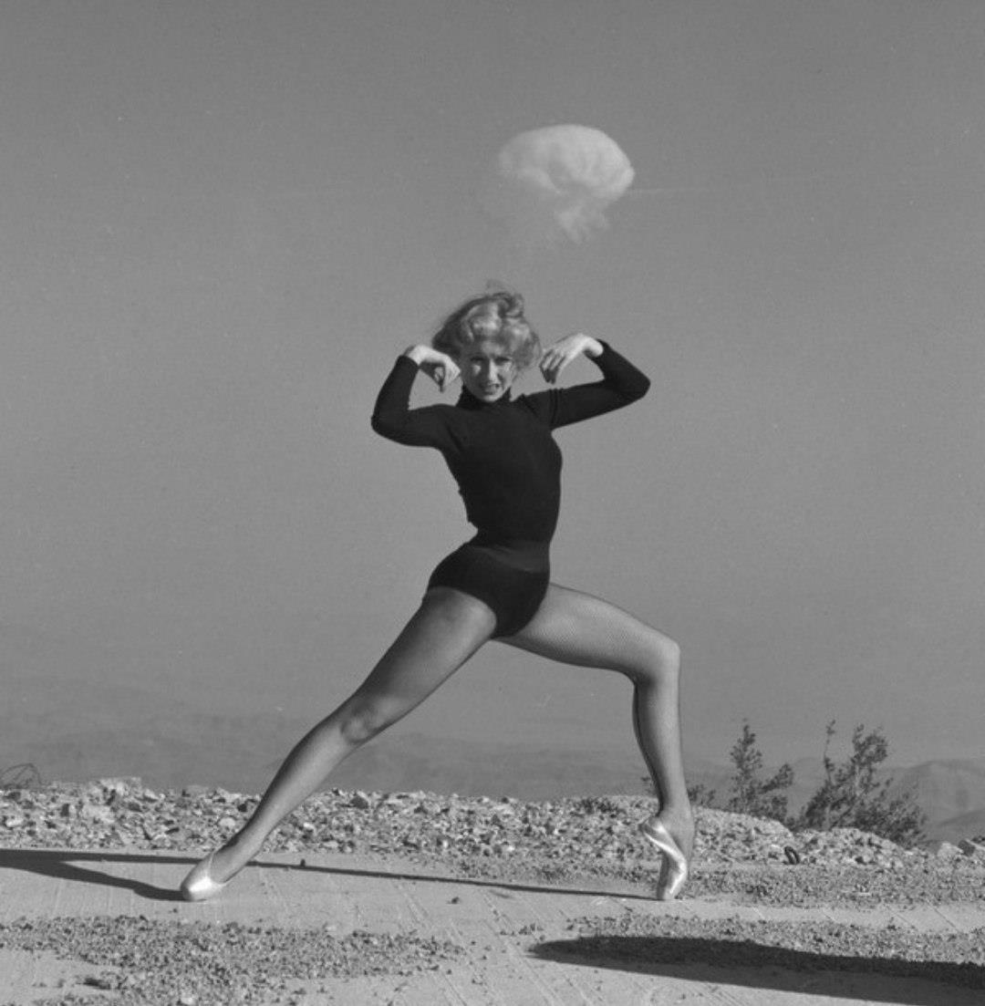 После того, как американские военные сбросили атомные бомбы в Японии в 1945 году, в течение следующего десятилетия они провели более 1000 ядерных испытаний уже у себя в Неваде. То есть они буквально объявляли дату очередного взрыва, а американцы ехали на юго-запад страны, чтобы полюбоваться атомными грибами, выраставшими над испытательным полигоном. Ну и, конечно, пофоткаться, как эта танцовщица на снимке.