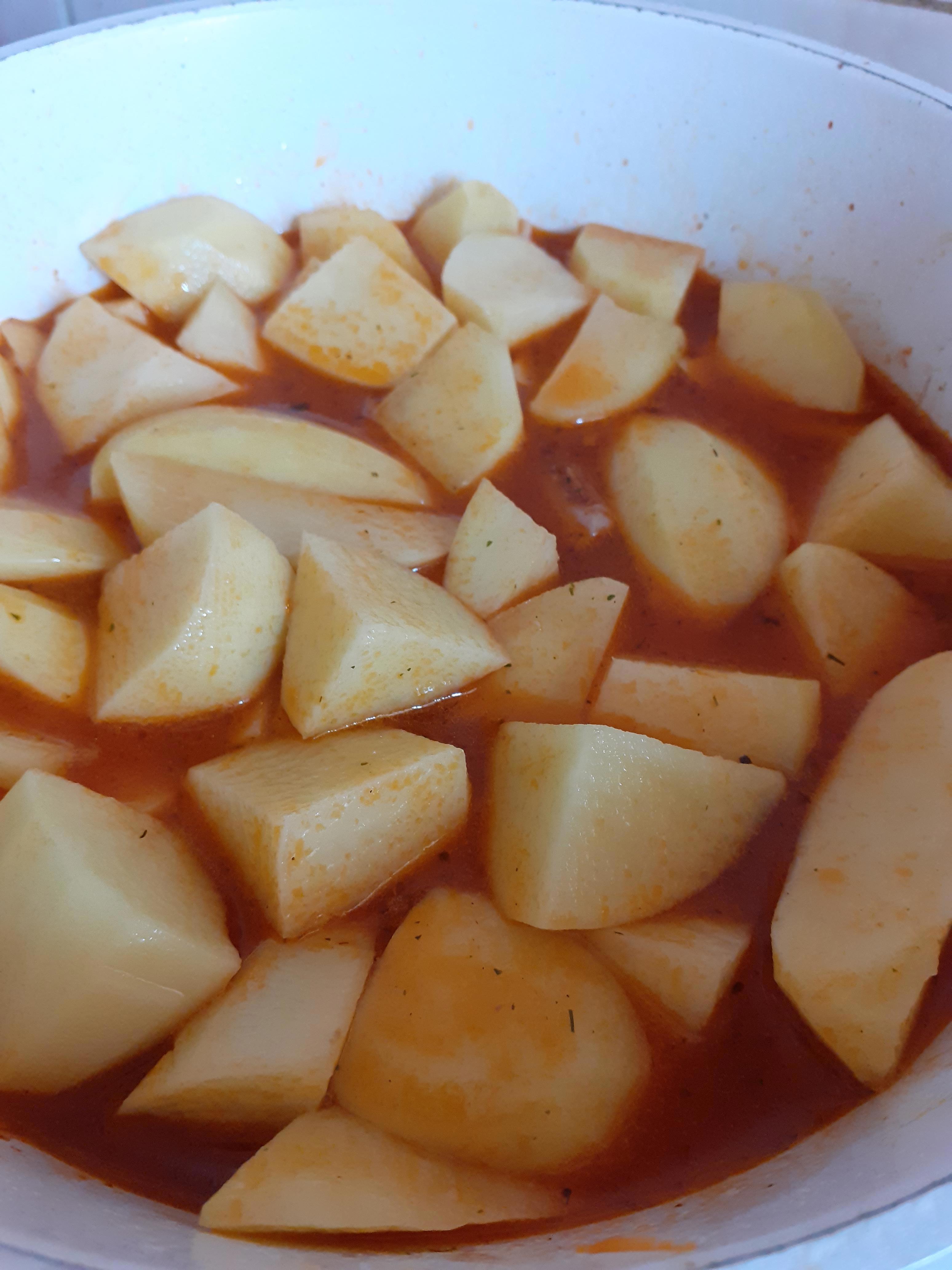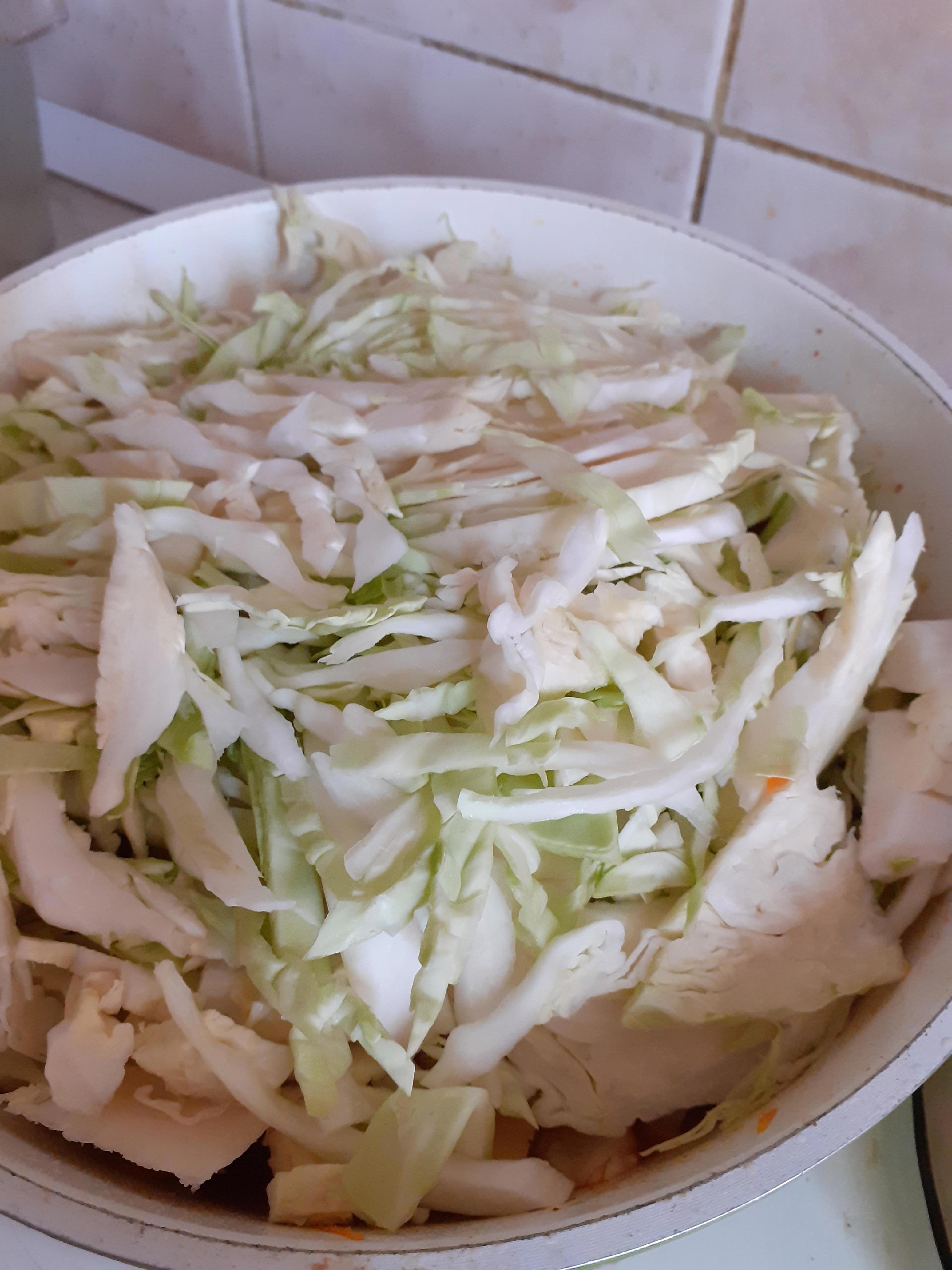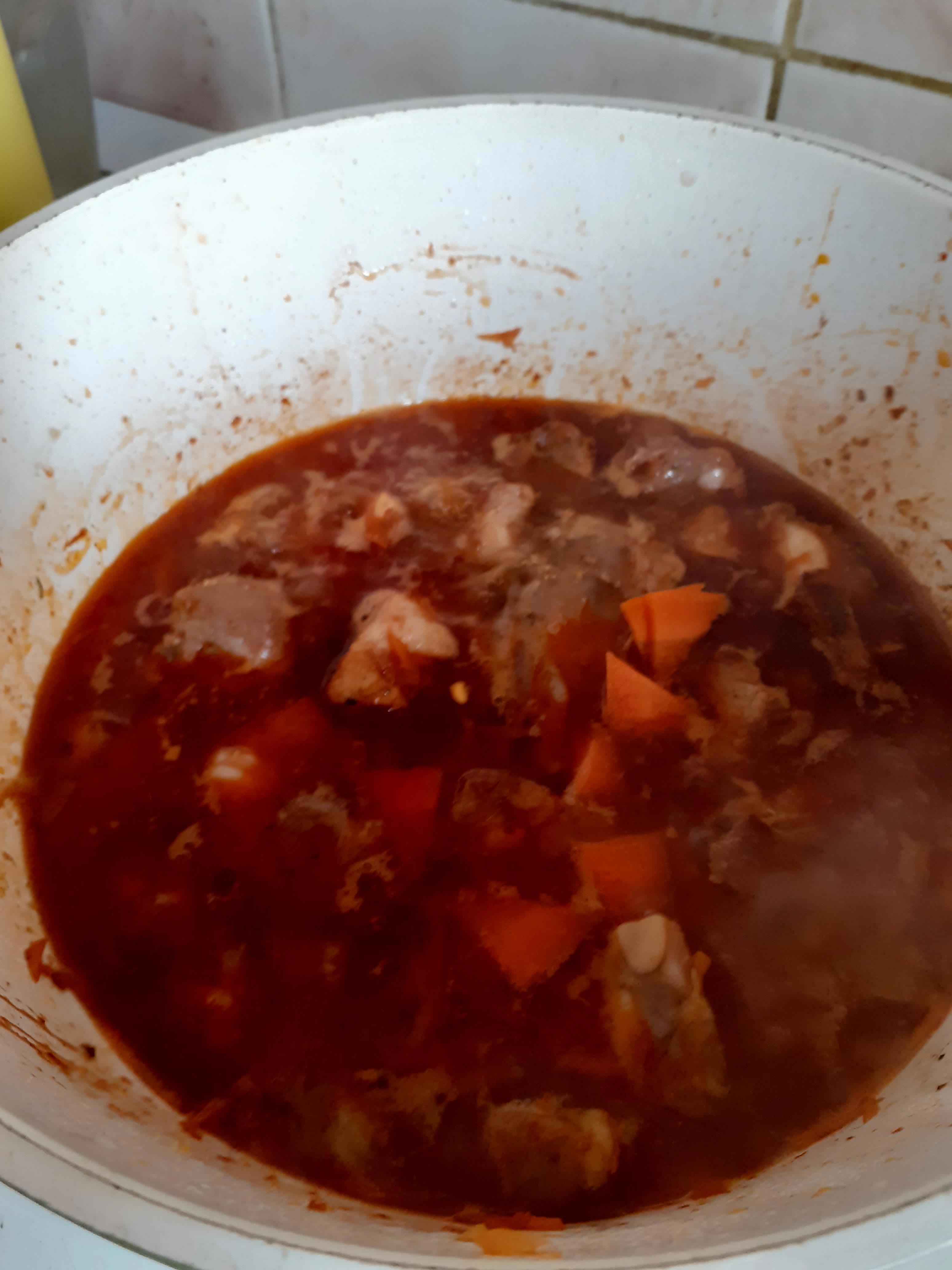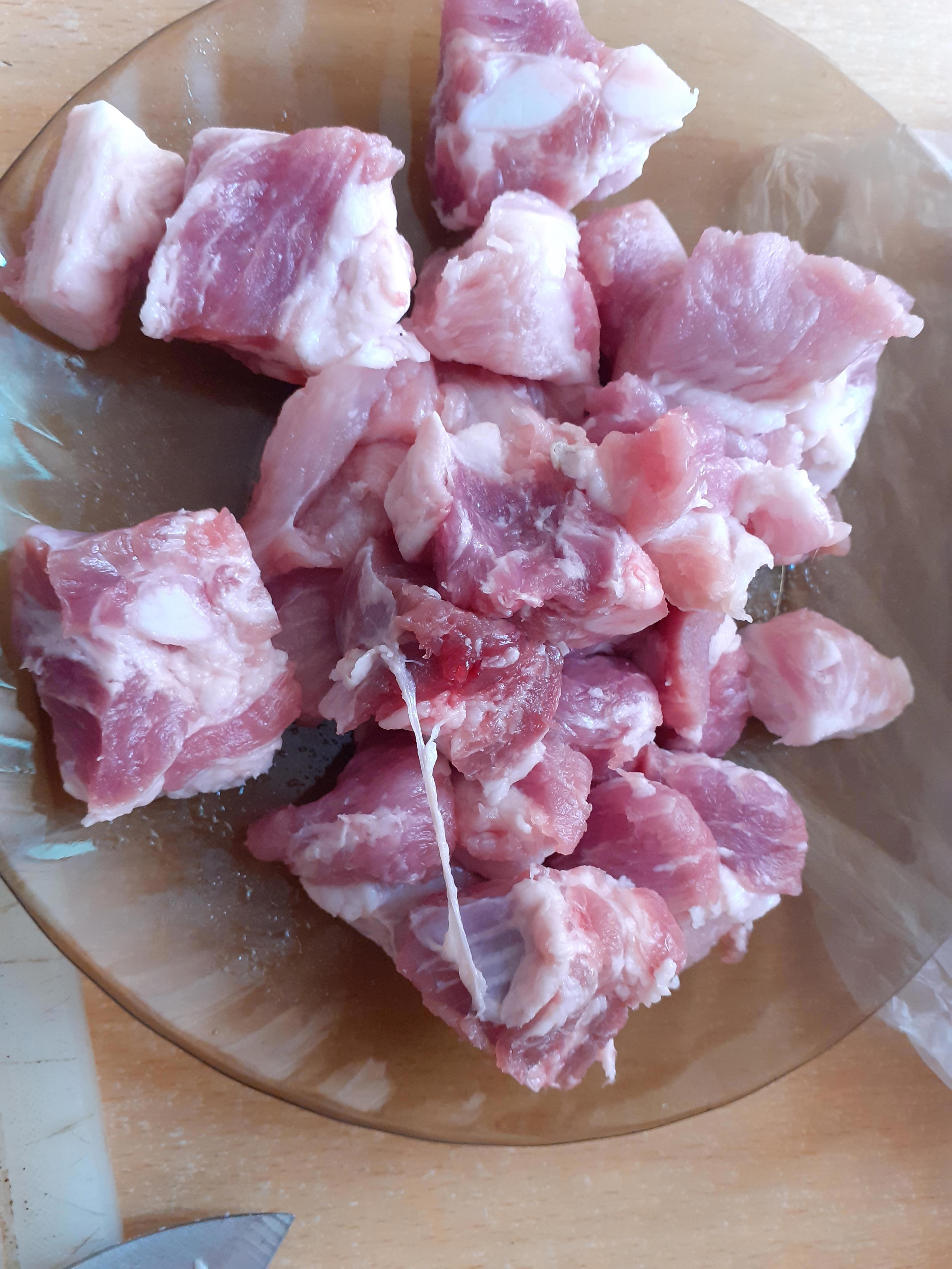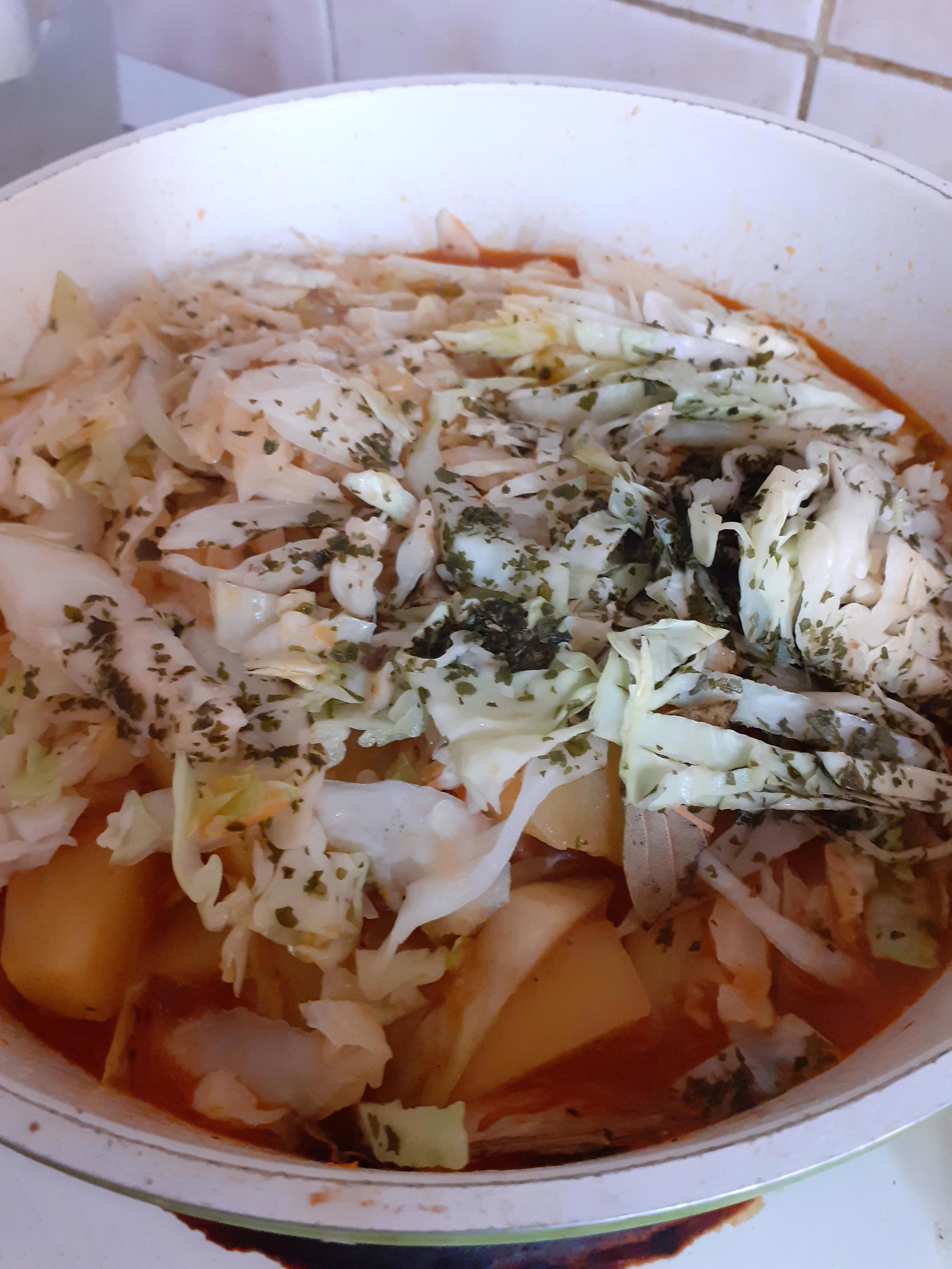 Свинина. Лук. Морковь. На масле. С солью и специями. Потом тушил с водой несколько минут. Картофель залил полностью. Медленно. Капуста на пару в конце. Зелень и лавровый лист.