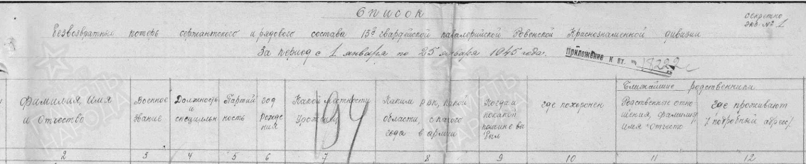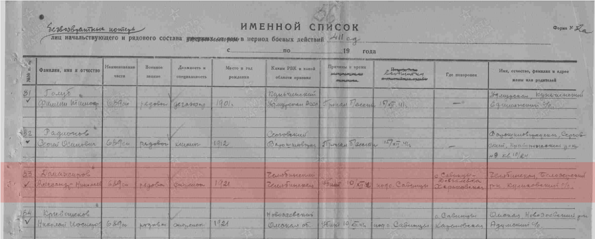 В списке безвозвратных потерь 689-го стрелкового полка есть ошибка отчество Александра - Николаевич, хотя напутать с документами легко если есть только фамилия и инициалы имени отчества. Остальные данные сходятся. Так что правильно расшифрованная строка будет выглядеть так.