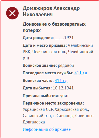 83./ Доможиров Александр Никанорович./ 689 сп./ рядовой./ стрелок. /1921. /убит 10.12.41./ под с Савинцы./ с Савинцы - Довгалевка Харьковской обл. /Челябинская обл, Белозерский р-н, Куликовский с/с.