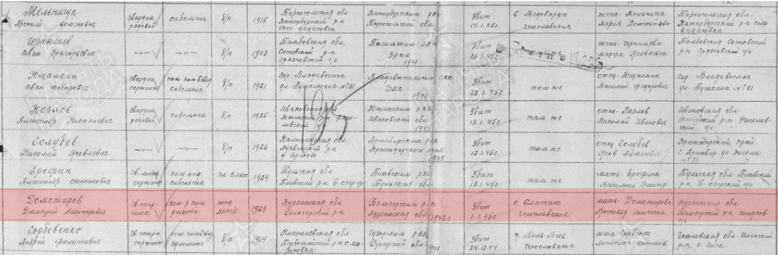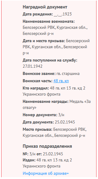 Есть небольшая запутка с областью. Всё дело в том, что Курганскую область образовали только в 1943-м году из нескольких районов Свердловской, Тюменской и Челябинской областей, так что до 1943-го года Белозерский район входил в состав Челябинской области. Хотя, если документы писали в 1945-м, то всё верно.