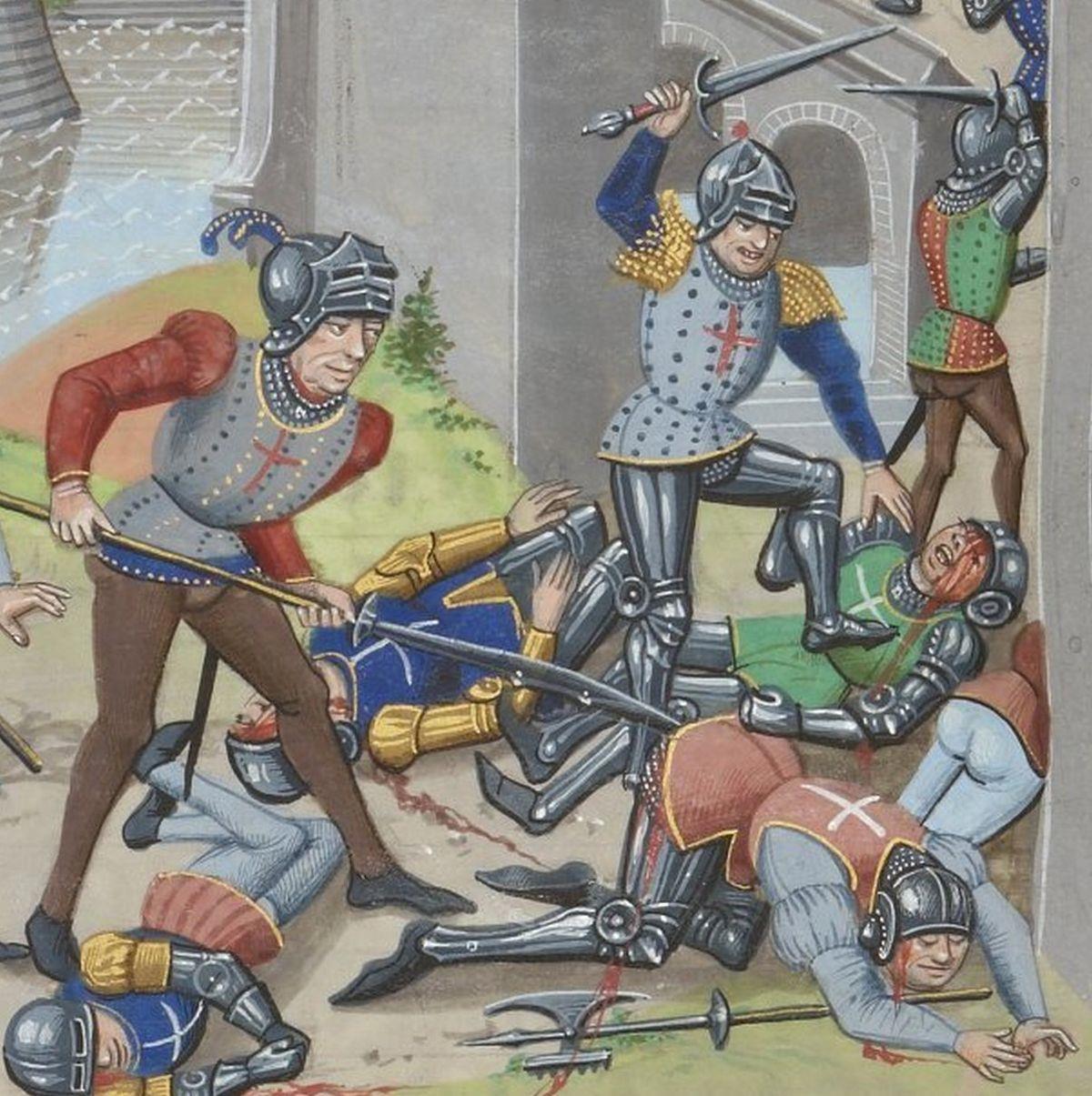 Как обычно, бей лицо, коли яйцо - результативная, годная тактика. Как обладатель цервельера с ронделями (примерно такие у троих пострадавших) скажу - в таком шлеме получать древковым в голову категорически не приветствуется.