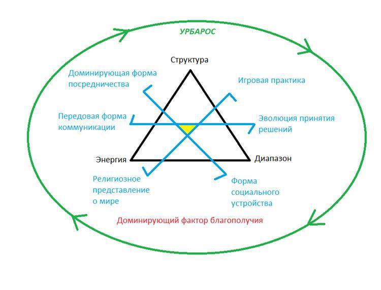 Треугольная структура модели (см. схему) наглядно показывает, что энергия, структура и диапазон образуют не только устойчивую плоскость, но и задают объём — объём смыслов, в котором могут развиваться все остальные элементы.