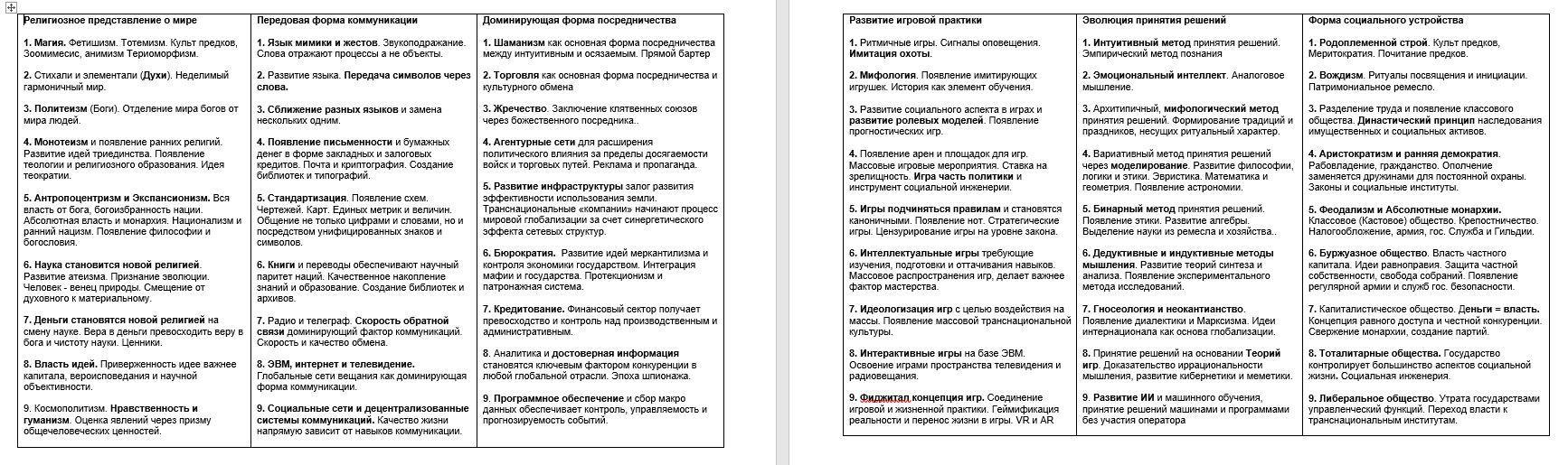 Ниже представлена реконструкция этих витков на основе шести фундаментальных осей: религиозного мировоззрения, коммуникации, посредничества, игры, принятия решений и социального устройства.