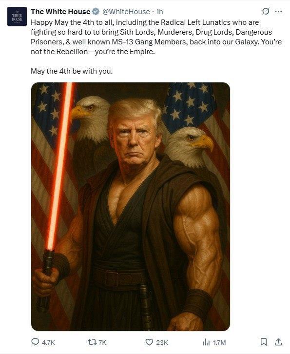 Белый Дом, который в Washington, D.C., опубликовал поздравление с 4 мая. На прикрепленной картинке - Дональд Трамп со световым мечом в руке.