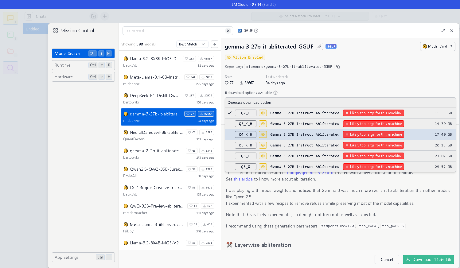 Идем в модель search вводим в поле поиска abliterated (что обозначает модель без цензуры.) Находим модель gemma-3-27b-it-abliterated-GGUF, кликаем на нее мышкой, в окне справа видим информацию о модели и в выпадающем окне варианты модели, которые мы можем загрузить. Более менее разумные ответы которые и дают эффект присутствия при получим с модели 27b-it-abliterated-GGUF 8Q... и выше (вычислено экспериментальным путем) .