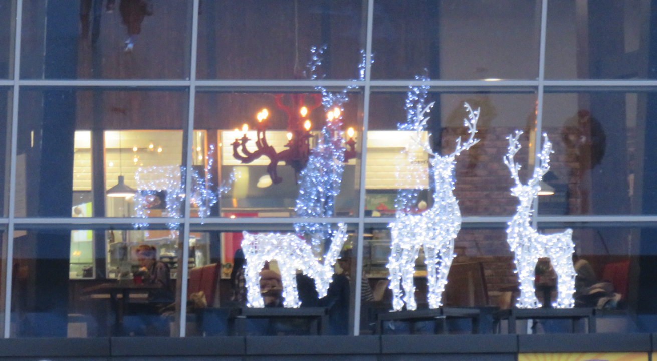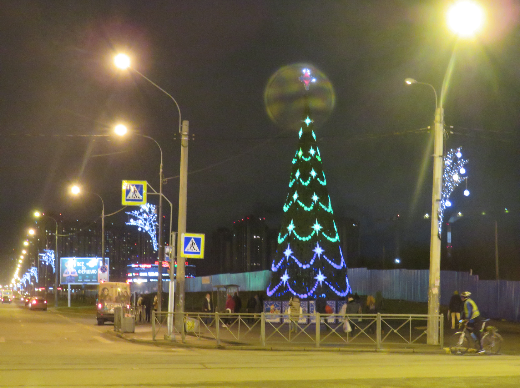 И наша Парнасовская луна. Елка, конечно же, искусственная, выполнена в виде конической рамы, на которую надет елочный камуфляж. Место выбрали неудачное, через дорогу между торговым центром и метро большая площадка метров сто на сто...