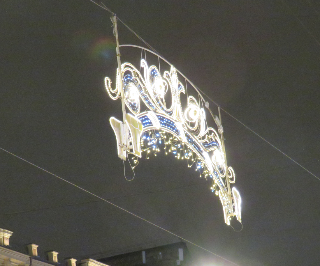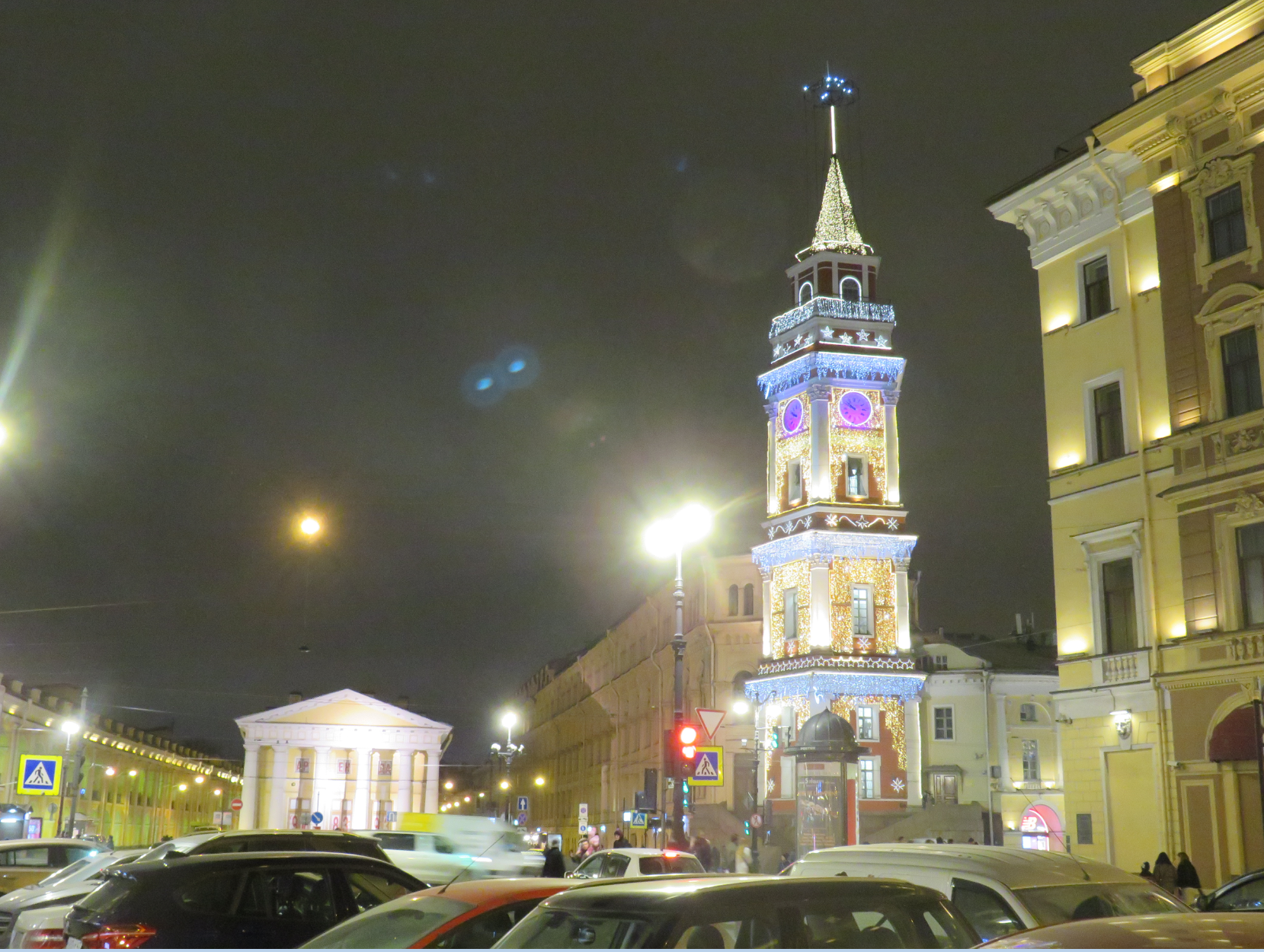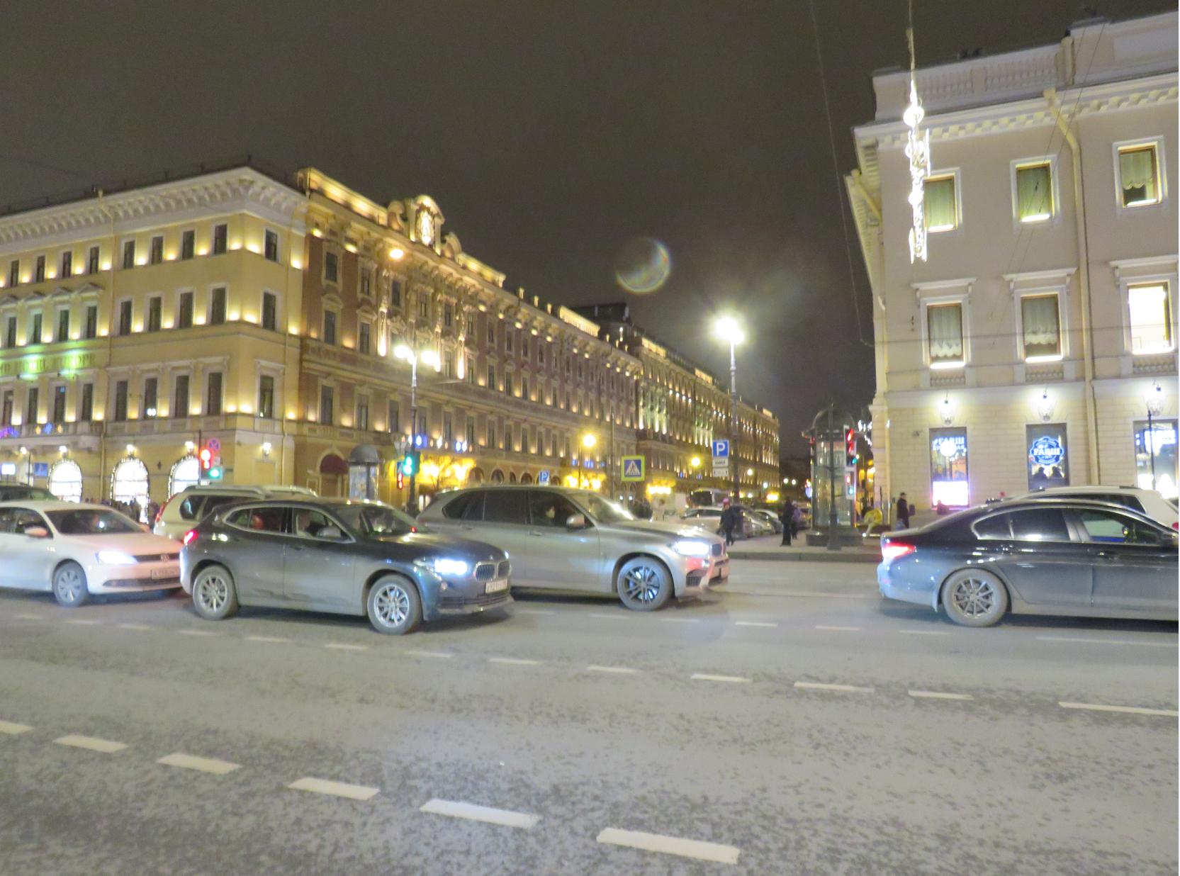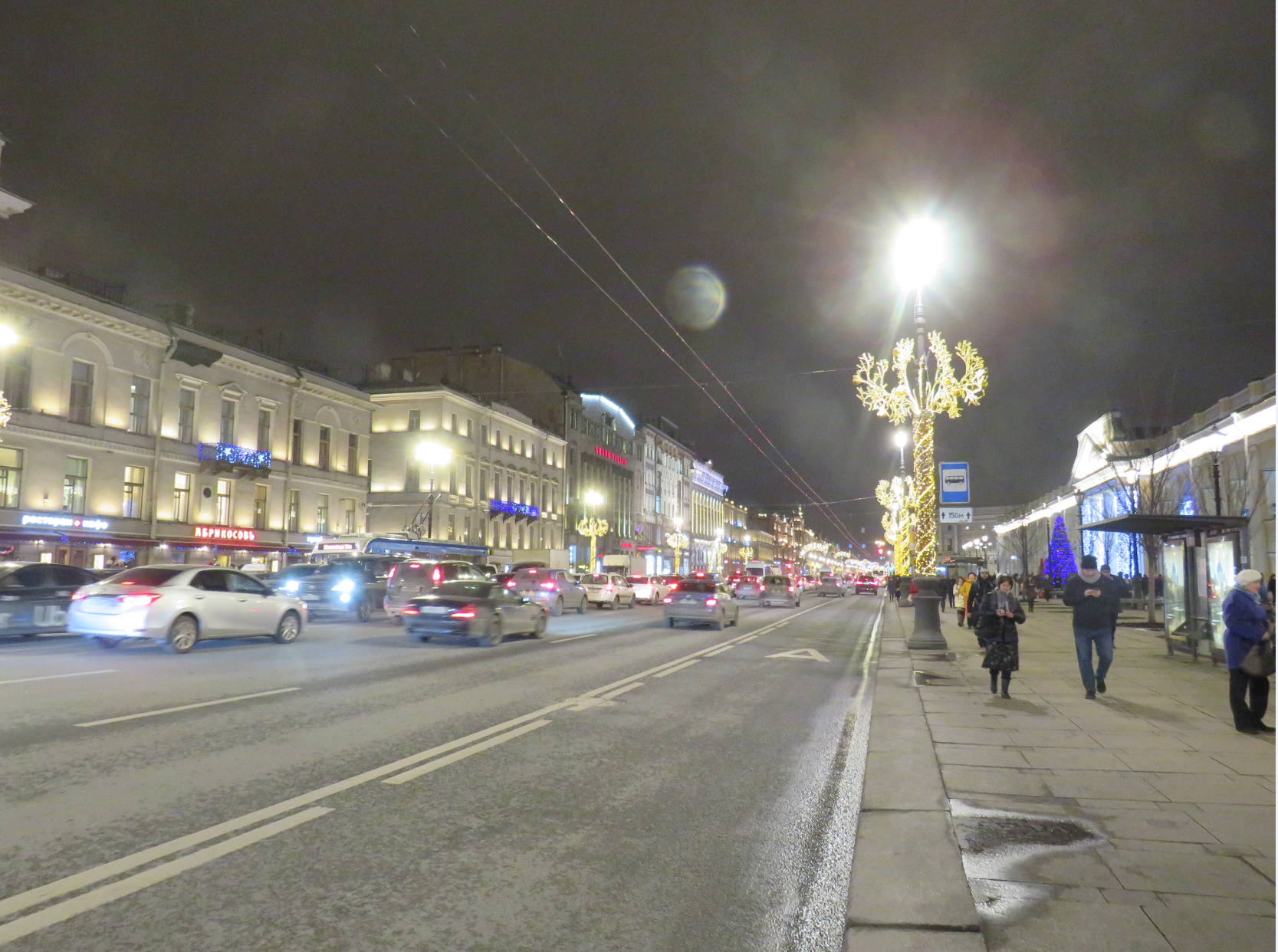 А это вечерний Невский, снимок от 26-го декабря 2019. И снова луна, невидимая глазами за облаками. Однако мое чудо техники сумело ее сфотить!