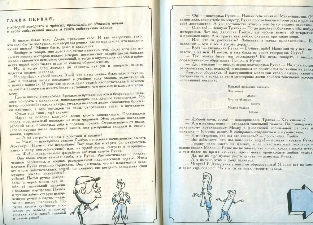 Жили-были в школе тётушка Тряпка, дядюшка Глобус, красотка Ручка с золотым пером и самый обычный Мелок. Когда внутри оставался только сторож, эти четверо отправлялись путешествовать куда пожелается – поглазеть на динозавров, заглянуть на коралловые острова, узнать о рабском труде, подивиться на огромные производства и оказаться глубоко под землёй.