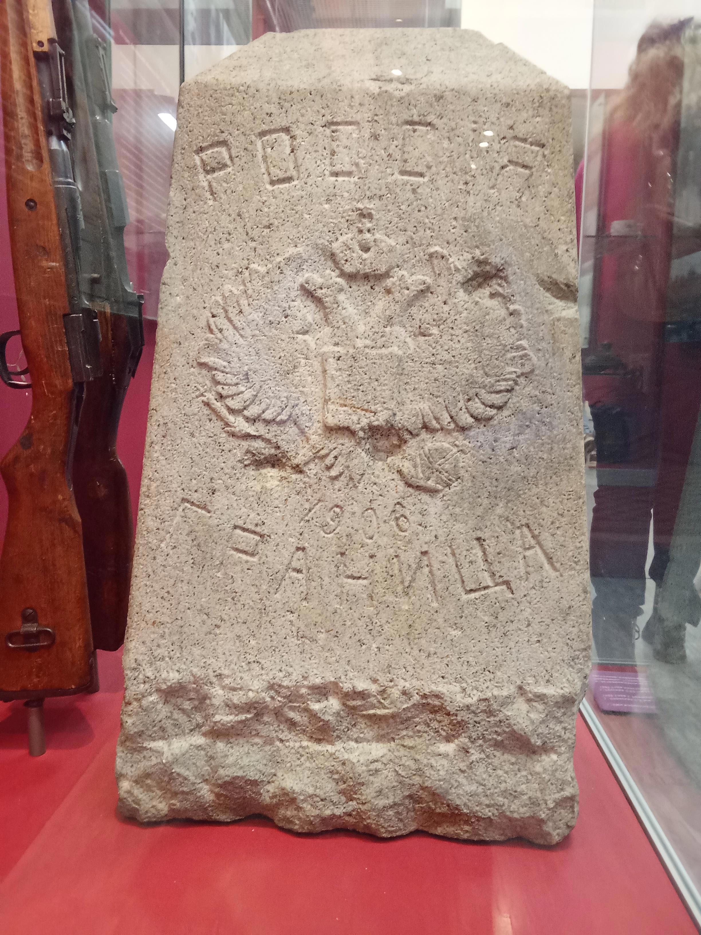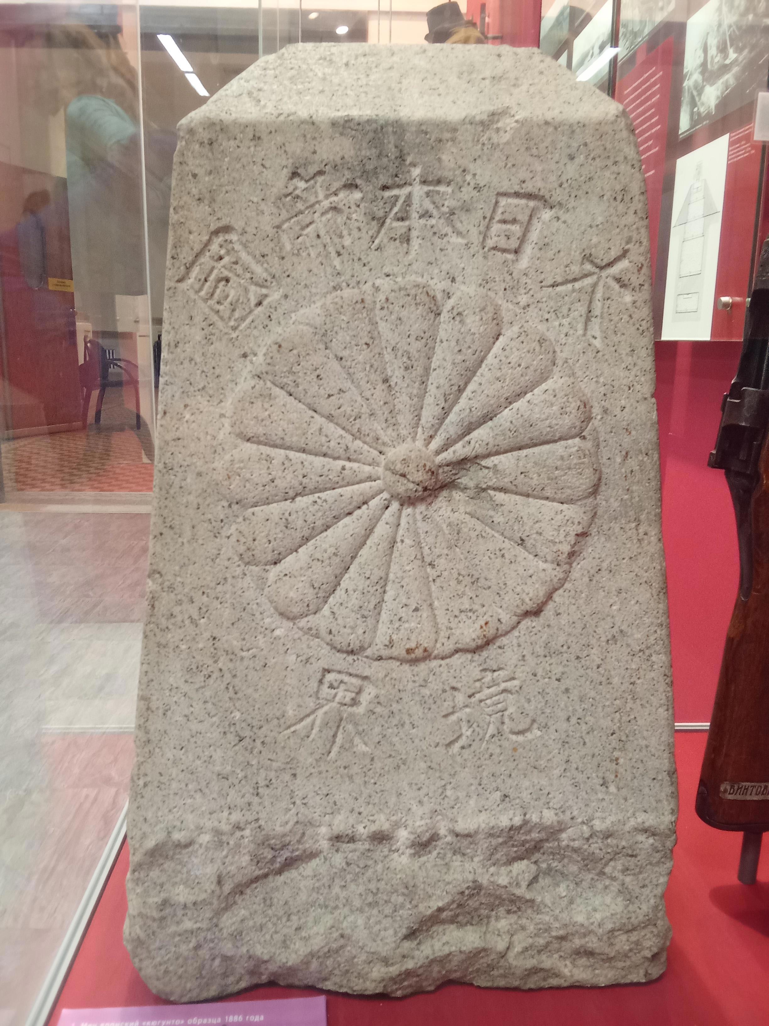 Пограничный столб, с одной стороны которого высечена японская 16-лепестковая хризантема, а с противоположной — двуглавый орёл.