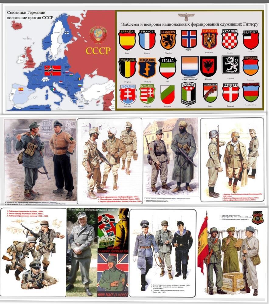 В войне против Советского Союза участвовал не только Вермахт, а и армии союзников и сателлитов Германии. На22 июня 1941 года, кроме немецких соединений, у границ Советского Союза развернулись 29 дивизий и 16 бригад союзников Германии -- Финляндии (за все время войны 530 тысяч штыков), Венгрии (200 тысяч штыков), Хорватии (5000 штыков) и Румынии (за время войны один миллион штыков). То есть 20% армии вторжения составляли войска немецких сателлитов, а когда к концу июля 1941 года к фашистским войскам примкнули Итальянские (229 тысяч штыков), Испанская "Голубая дивизия" (19 тысяч штыков) и Словацкие дивизии (36 тысяч штыков), процент союзников Германии будет иногда достигать трети сил вторжения Рейха. (Болгария как всегда в мировые войны, в благодарность России за освобождение от Османского ига, воевала на стороне Германии, она не вела прямых боевых действий против СССР, но армия Болгарии входила в оккупационные войска на территории Греции и Югославии (Хорватские войска в количестве трех дивизий, там так же отметились), чем освобождали для Восточного фронта, солидные контингенты Вермахта и СС. Ну и со всей Европы тянулись к Гитлеру соратники и адепты. Вермахт СС постоянно пополняли Европейские и прочие добровольцы, за войну их было почти два миллиона. Они были объединены в 59 дивизий, 23 бригады, несколько отдельных полков, легионов и батальонов. Для РККА, это был минимум лишний год войны.  Вот данные скомпилированные из разных источников, про "Добровольцев фюрера" из некоторых Европейских и не очень стран.