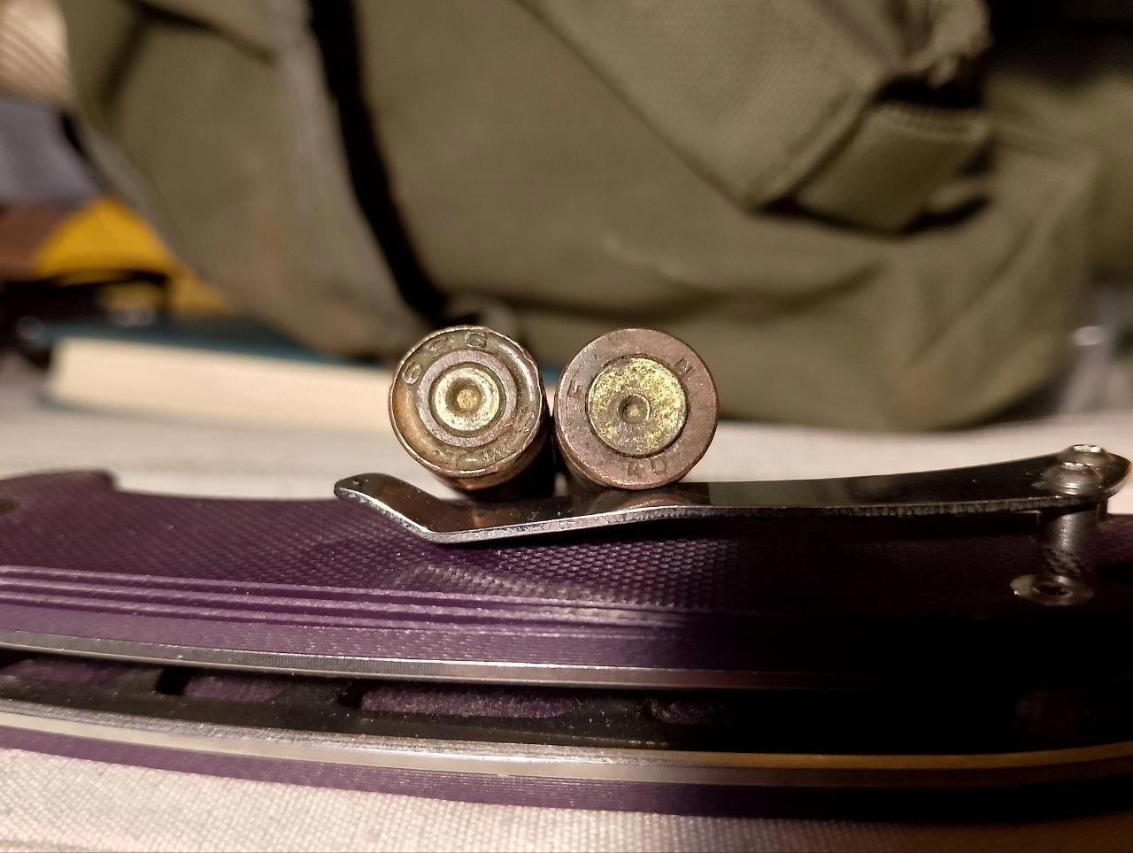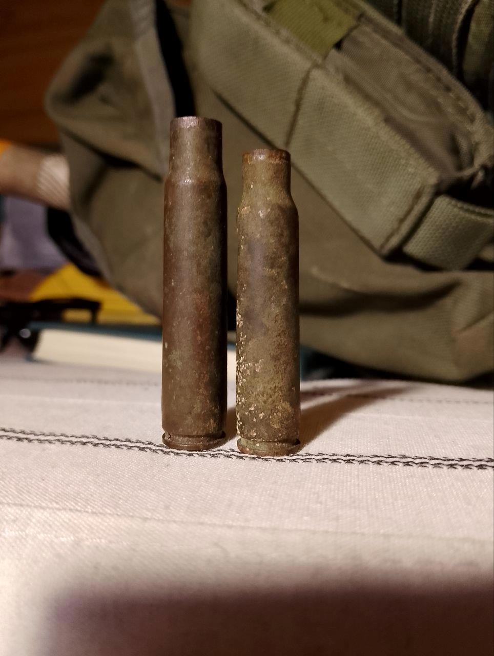 Слева - 7,92х57 от винтовки Маузер 98. А вот справа, насколько нам удалось понять без штангенциркуля, гильза от патрона 7,35х51 Каркано, применявшемся в винтовке Манлихер-Каркано М1891 модификации образца 1938 года.