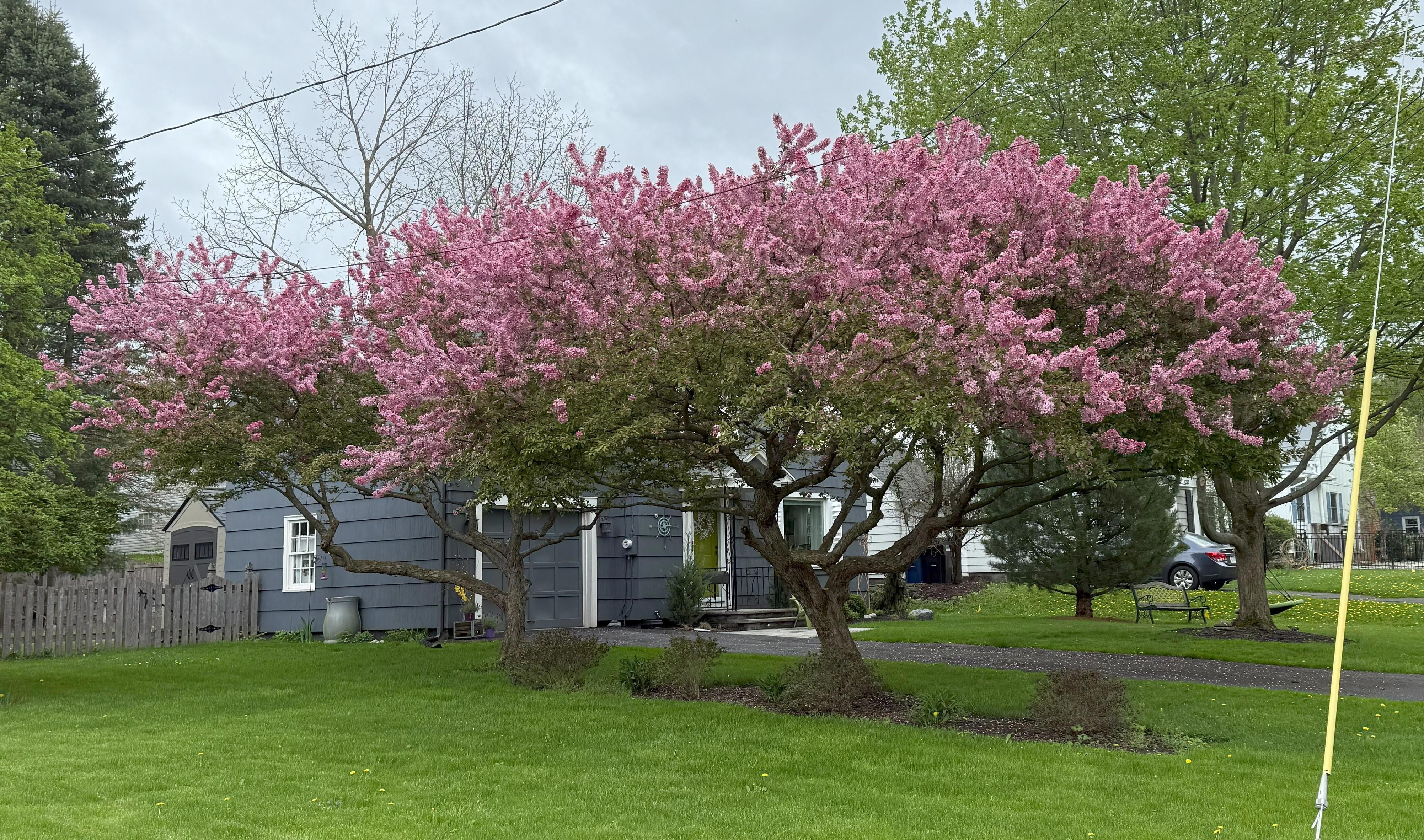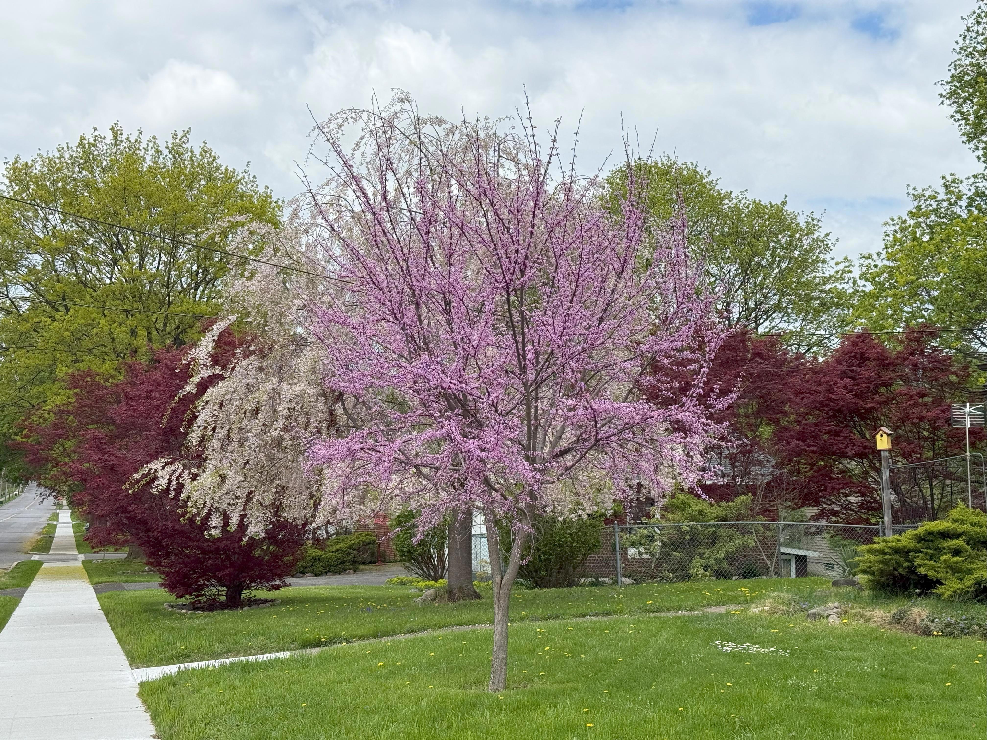 А тем временем красивая магнолия из предыдущего фотопоста, уже пару дней как полностью облетела. Остались только какие-то зачаточные листочки. Но вместо неё вот ещё красивые деревья, которые до сих по цветут.