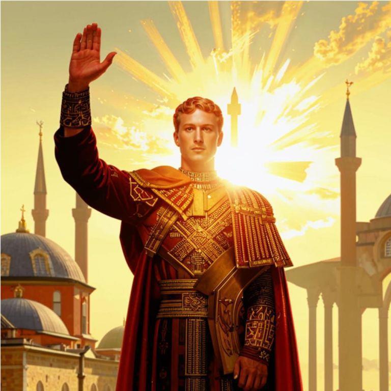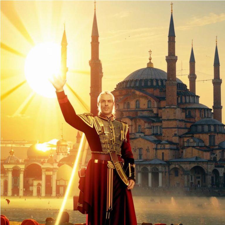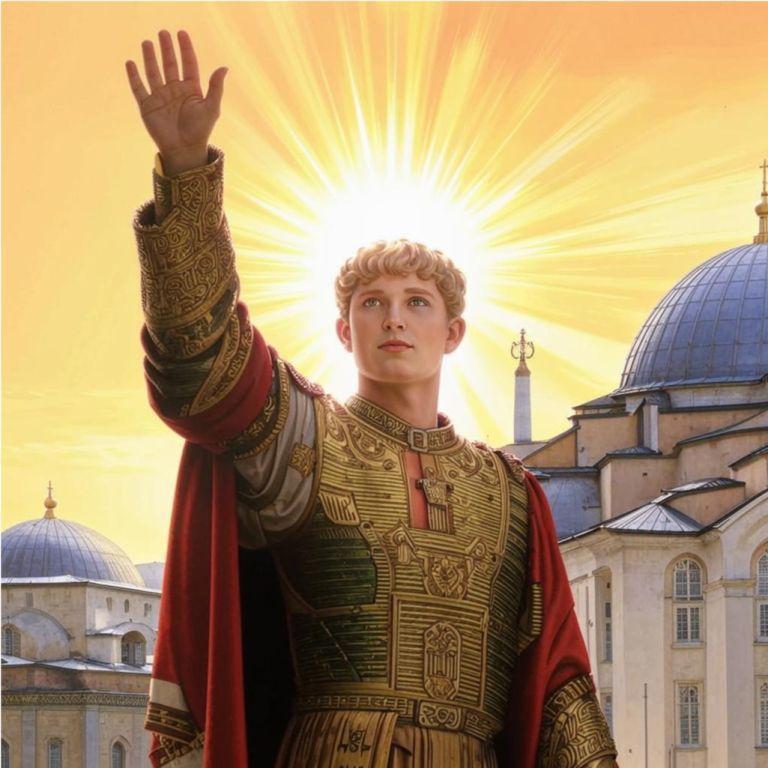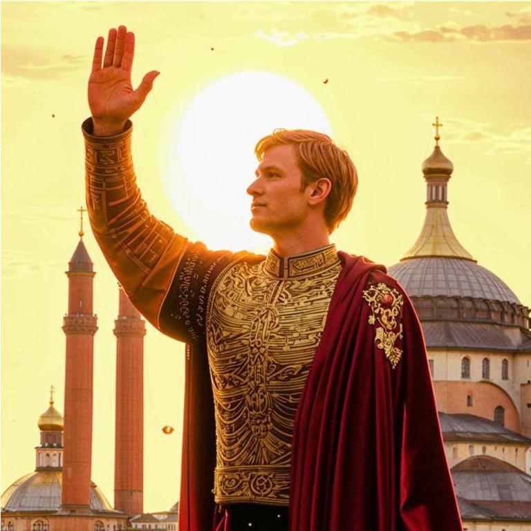 Но мне же нужно думать немного вперёд.) Поэтому вот немного отвлёкся от написания, что иногда полезно, и поиграл с нейросетью. Понятно, что на картинке должна быть Святая София и герой, который к тому времени должен стать императором. Фёдор и выбрал где-то римский пусть, как в перестройке русского общества и формировании армии. Первый легион уже существует и успешно давит врагов. Ещё ГГ прибрал себе некоторые византийские символы, но государственный флаг у него, конечно, имперский стяг.