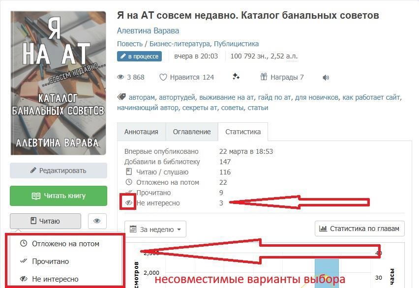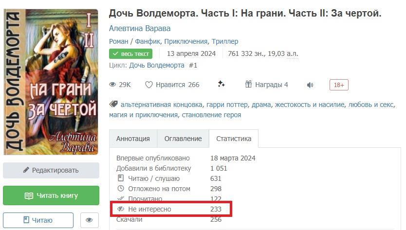 Автор: Алевтина ВараваДорогие друзья, на АТ нет дизлайков. Пометка «Не интересно», присвоенная вашей книге (её вы можете обнаружить в меню статистики на странице книги, но не внутри своего профиля, а именно на общедоступной странице; увидеть и расстроиться), – не значит, что кто-то прочёл вашу книгу и посчитал её неинтересной!