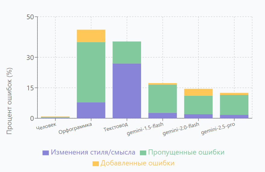 Я взял реальный текст, прогнал его через каждый инструмент и сравнил их результат с эталоном - оригинальным текстом, который я вручную вычитал, сохраняя авторский стиль, но правя все ошибки. Используя полученные данные, я составил таблицу и график. Оригинальные результаты у меня также сохранены, лежат на гитхабе