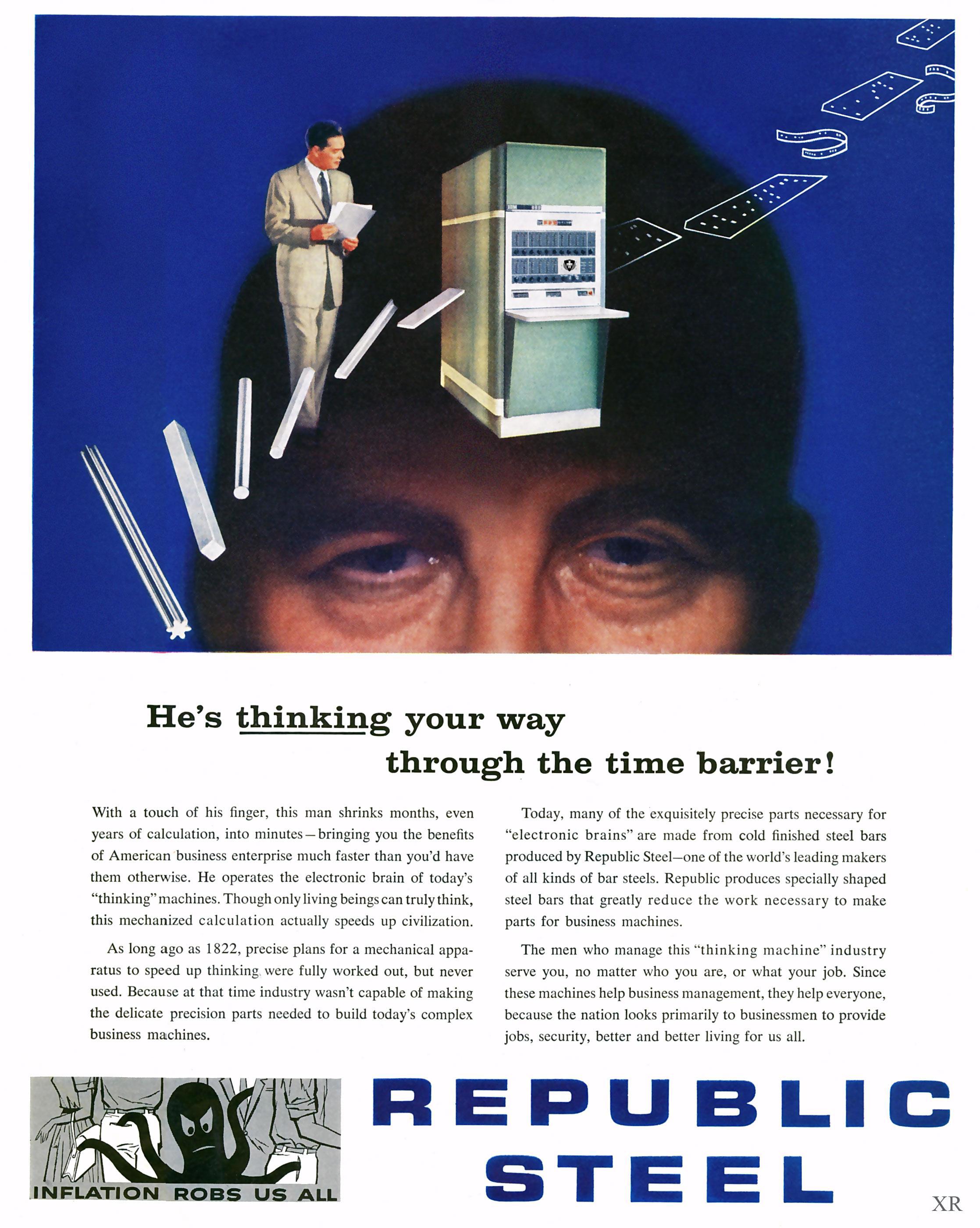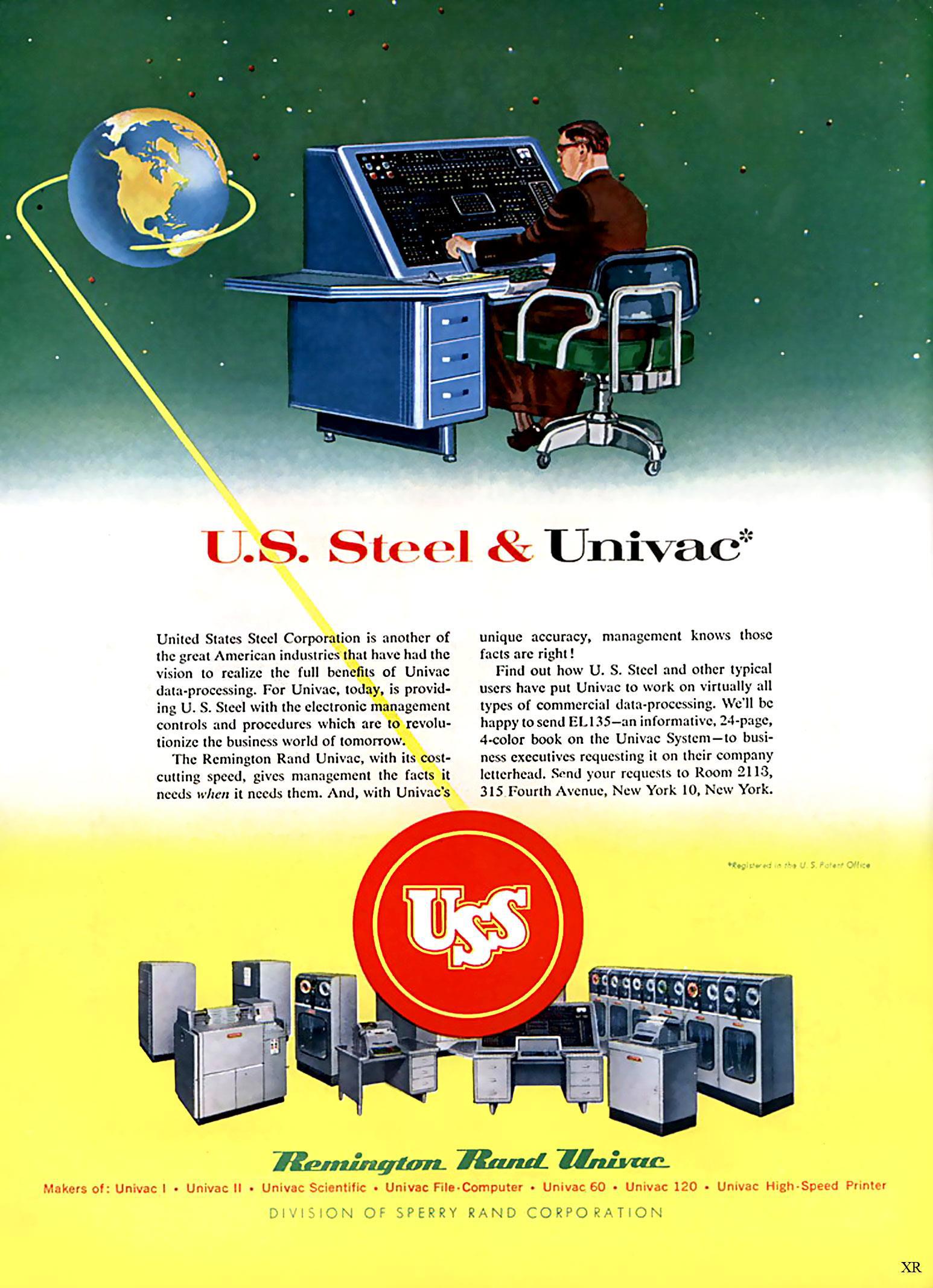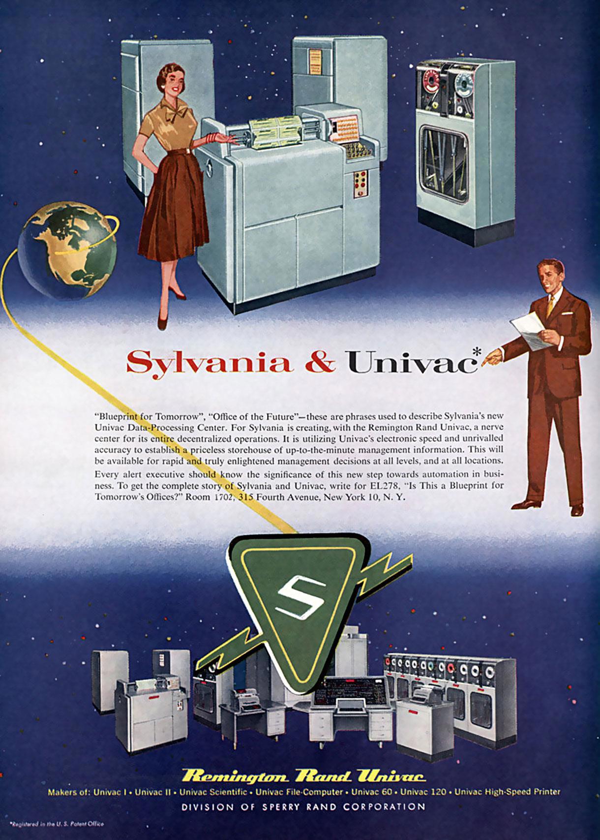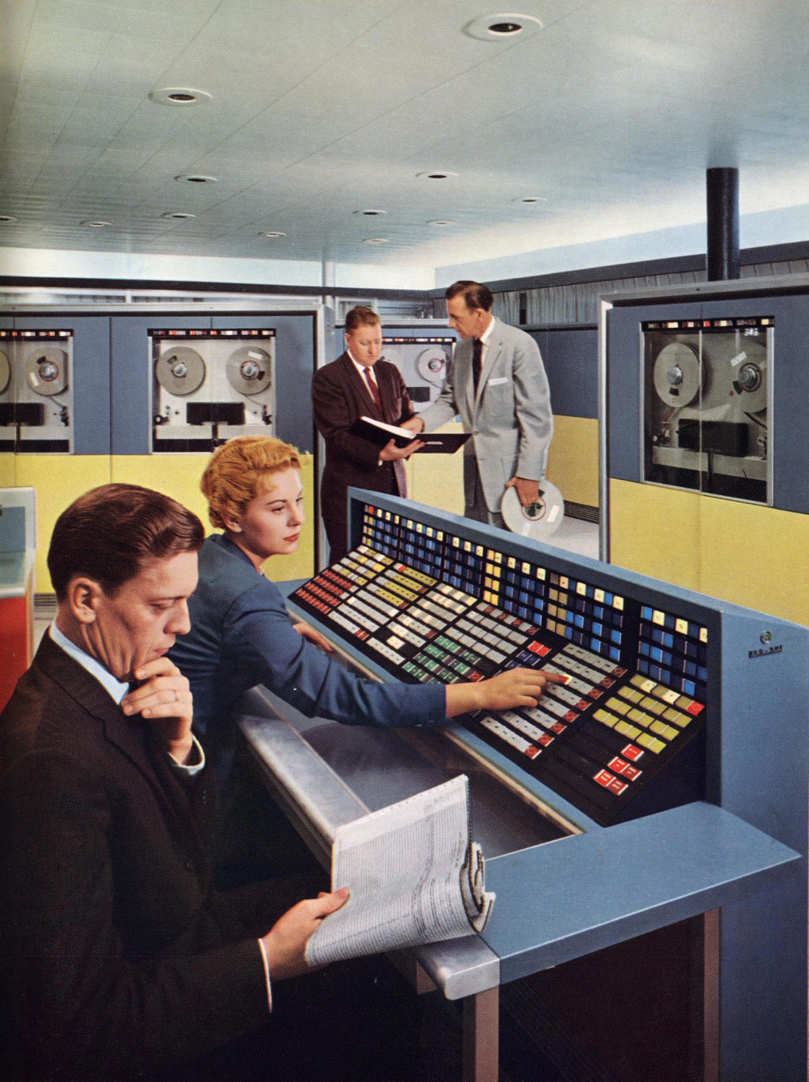 Заодно решил в блоге сделать подборку с картинками раритетной компьютерной техники из моей коллекции ретроиллюстраций. Когда компьютеры еще были на перфокартах, без экранов. Даже не понимали тогда, зачем они вообще нужны.