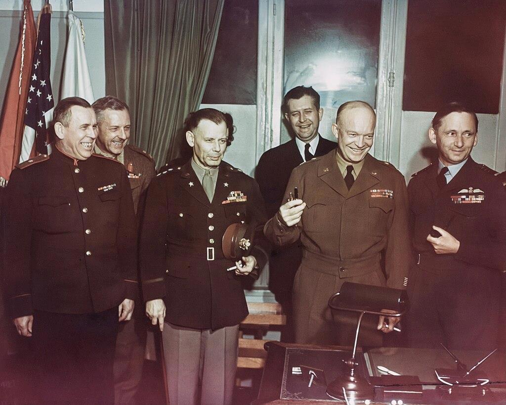 Подписание капитуляции в Реймсе. Спиной: Ганс Фридебург, Альфред Йодль, Вильгельм Оксениус. В центре, слева от свободного стула — Уолтер Беделл Смит, справа — Иван Суслопаров