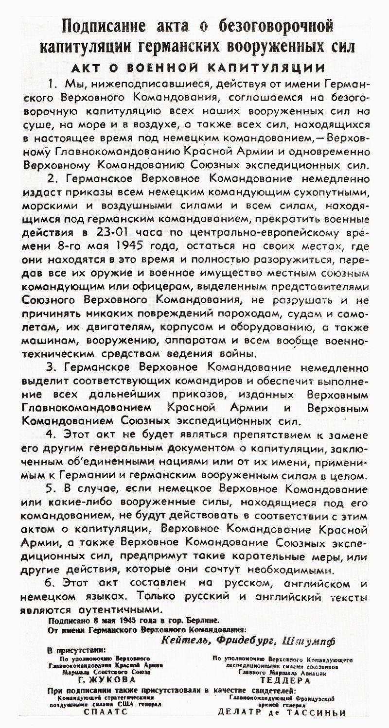 Автор: Nil Магия и разумАкт о безогово́рочной капитуля́ции герма́нских вооружённых сил (англ.German Instrument of Surrender, фр.Actes de capitulation de l’Allemagne nazie, нем.Bedingungslose Kapitulation der Wehrmacht) — юридический документ, установивший перемирие на направленных против Германии фронтах Второй мировой войны, обязавший германские вооружённые силы к прекращению боевых действий и разоружению с недопущением уничтожения или повреждения военной техники, фактически означавший выход Германии из войны.