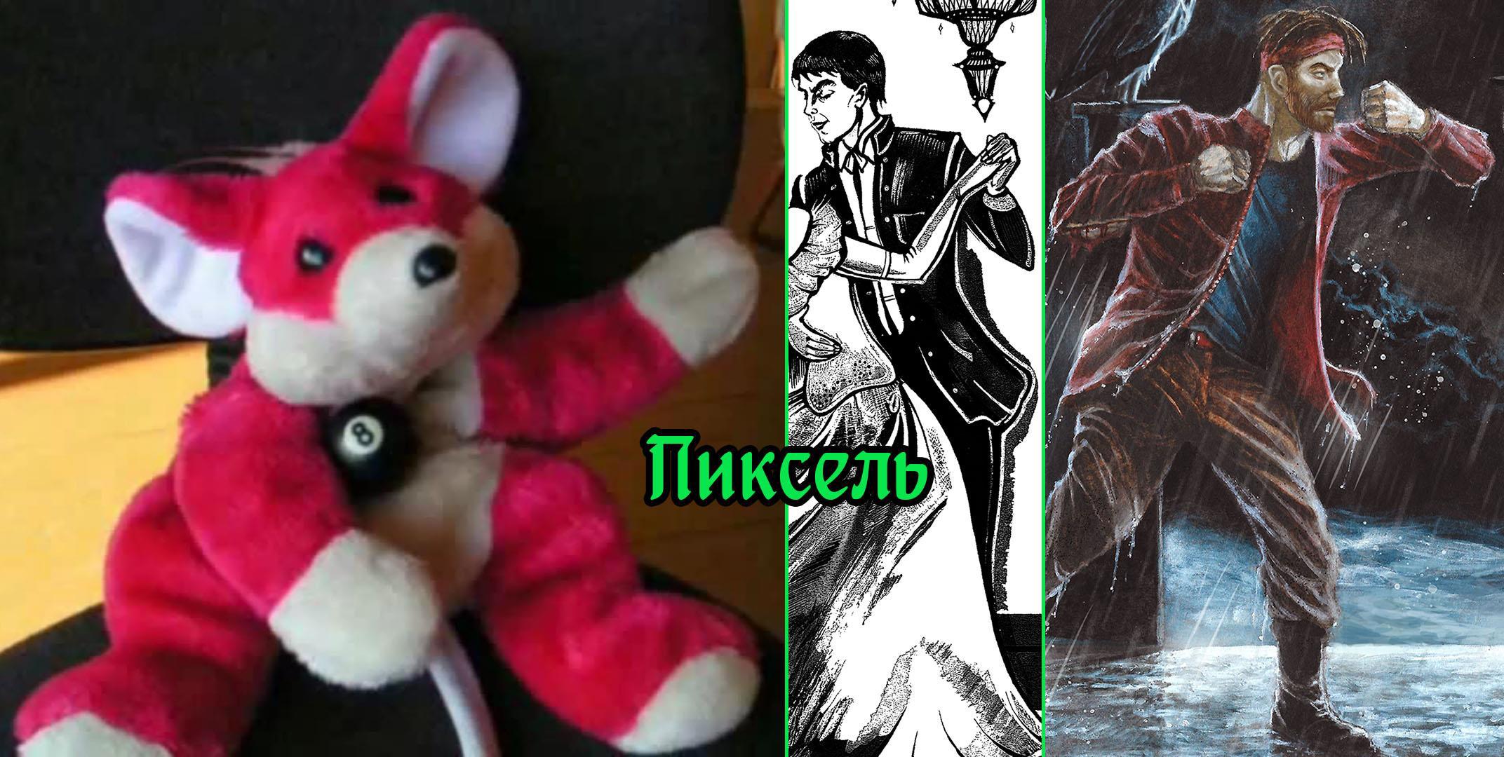 Пиксель: мягкая игрушка и иллюстрации к "Полёту Птитса" (Диана Кузнецова) и "Тени Одержимого" (Макс Мерзляков)
