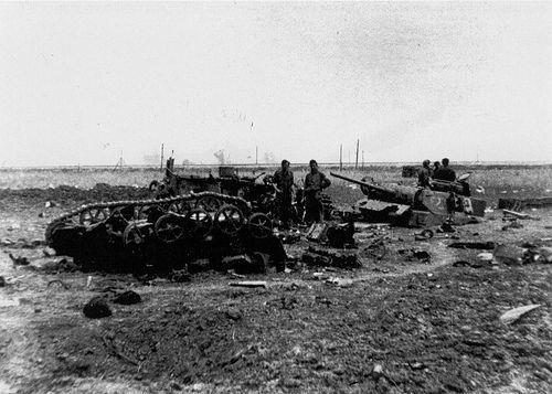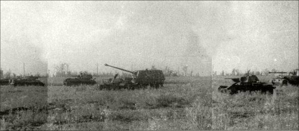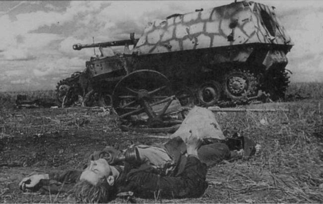 Минное поле в фугасами, на котором сначала подрывались немецкие машины, потом сгоряча влетели наши. Видны вперемешку Фердинанды и наши Т-34 и Т-70. Бруммбары в кадр не попали.