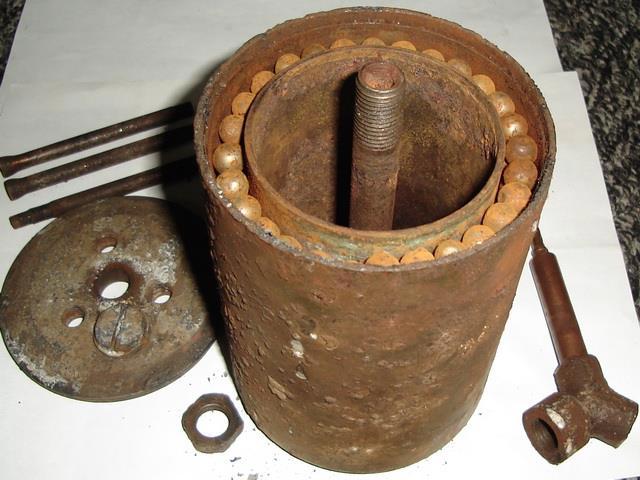 Мина лягушка "Шпрингмина" обезвреженная. Видны шрапнельные пули - поражающие элементы.