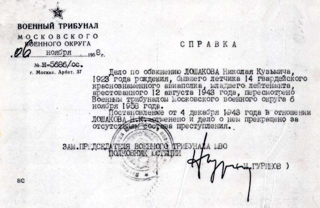 Летчиков в немецкой форме арестовали. Представителям военной контрразведки беглецы рассказали об обстоятельствах своего дерзкого побега. Но им не поверили… Да и как ни крути, они же носили немецкую форму. В ходе допросов, с применением мер физического воздействия, Денисюка «сломали»: он «признался» в измене Родине. А Лошаков стойко стоял на своем: Родине не изменял, и ничего подписывать не стал. К тому же он смог предъявить чудом сохраненную кандидатскую карточку члена ВКП (б).