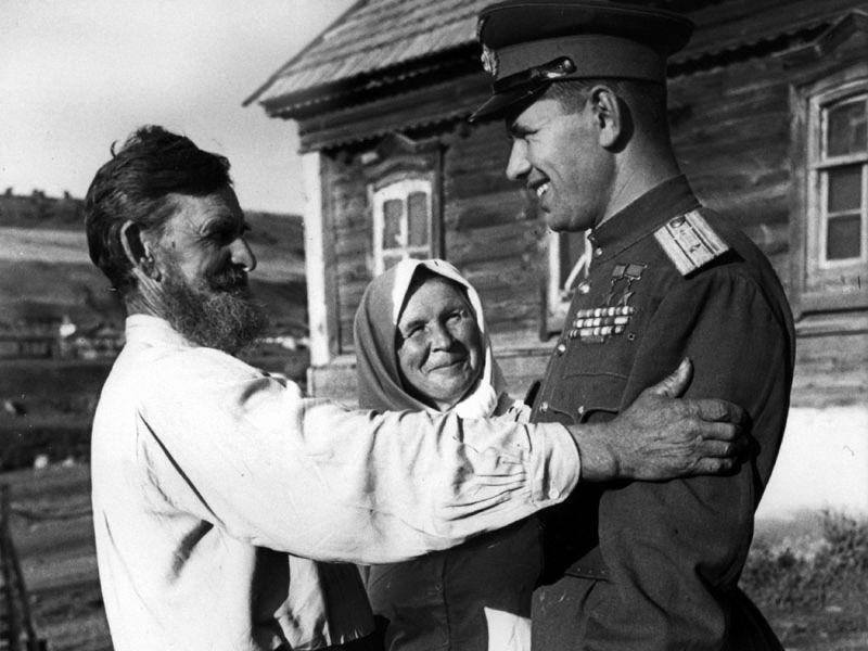 На фото: возвращение домой летчика, дважды Героя Советского Союза Николая Михайловича Скоморохова (1920-1994)