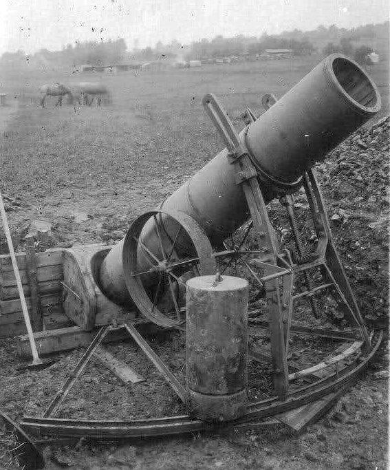 Сначала делаем калибром 250 мм, потом 350 мм, потом 450 мм! Из чего стрелять? Так ясен пень – из того же дерева! То есть те же плотники нам делают деревянный ствол, а чтобы его направлять куда нужно жестянщики делают треногу с рельсом. А чтобы ствол не разорвало – они его проволокой обмотали со всей ответственностью. Получилось вот такая штуковина: