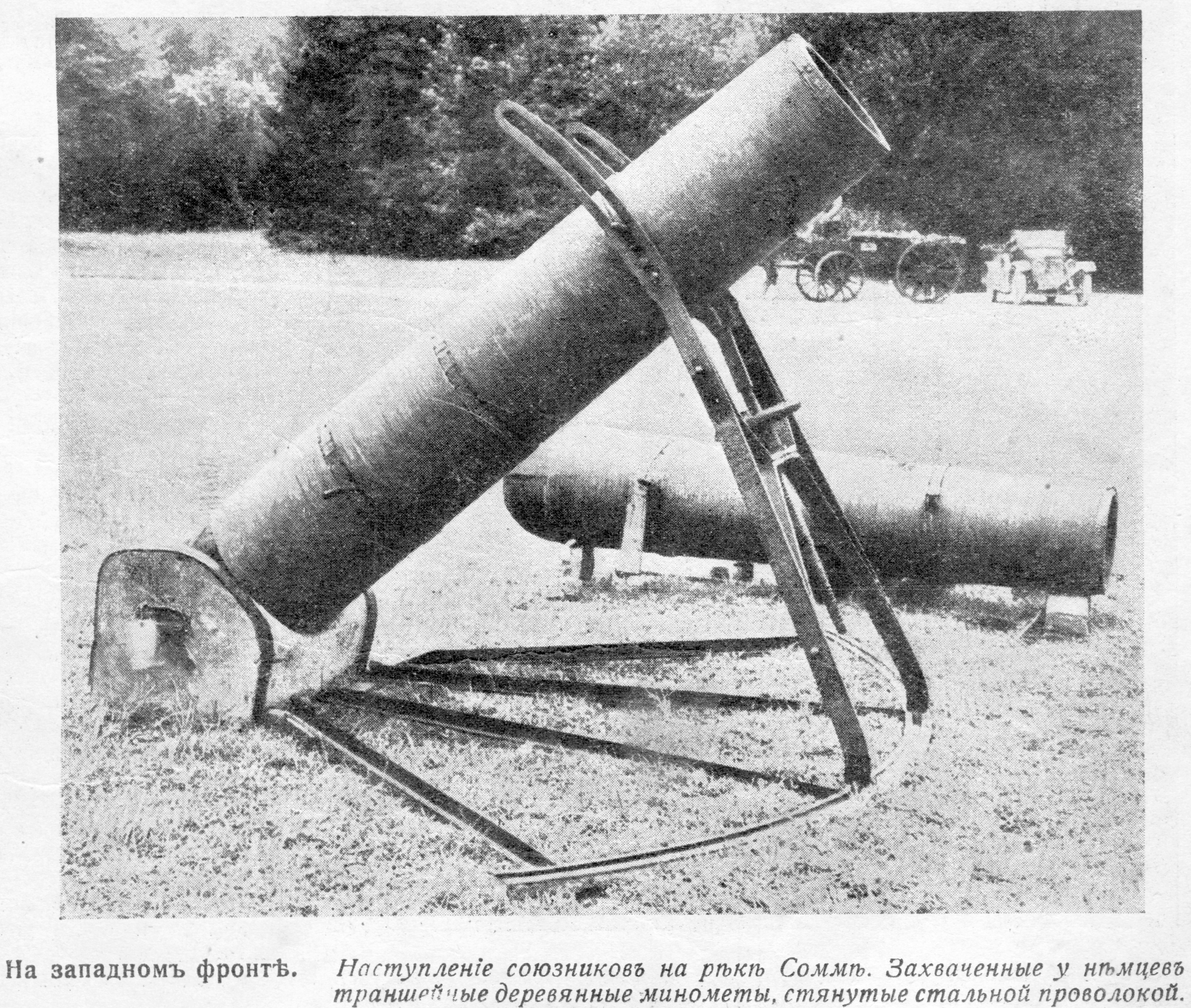 Делали бомбомёты, у которых мина была больше, чем ствол, и делали бомбомёты, у которых мина вкладывалась в этот самый ствол. Они потом переродились в миномёты. Стреляли эти штуки бомбами, да гранатами только вначале, а потом и в этом деле наступил плюрализм. Сделали мины, снаряжённые отравляющими веществами: