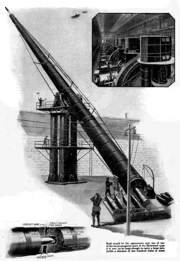 Например, норвежец Кристиан Олаф Бернард Биркеланд вообще был просто заворожён северным сиянием и старался узнать, как оно работает и о войне сначала вообще не думал. Однако ж, работая в 1901 году в своей лаборатории, он заметил, что металлическая мелочь, попадавшая в соленоид, вылетает оттуда с рекордной скоростью. Через каких-то десять лет он патентует метод выстреливания снарядов с помощью электромагнитных сил. В том же году собирается акционерное общество для реализации его идеи. На собранные деньги сделали опытную пушку – получилось «не очень». То есть снаряд вылетал со скоростью всего 50 м в секунду. Первым делом он, разумеется, побежал к ихнему корольку с сообщением о том, что тот сможет из своего Осло пулять по России. Тут сразу немцы прибежали с предложением купить компанию (как им всем всегда хочется по России пострелять…). Порешили провести торжественный (иначе не скажешь) показательный выстрел при всём блеске публики. Однако ж, бог всё видит – во время этих «показательных выступлений» в пушке чего-то «коротнуло». Искры, дымища, грохот, но в общем-то «никого не задело». Больше решили от греха не экспериментировать, а пушку отправили музей. Короче мечтали вот о таком: