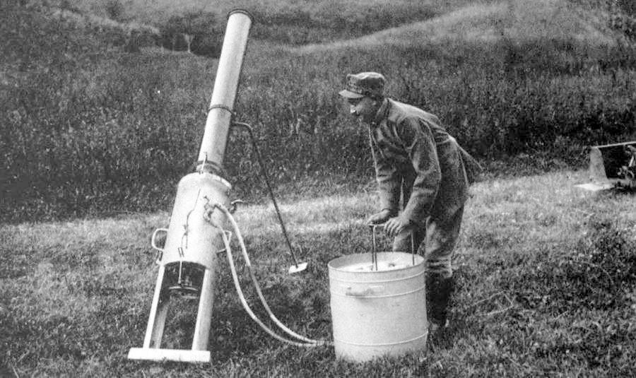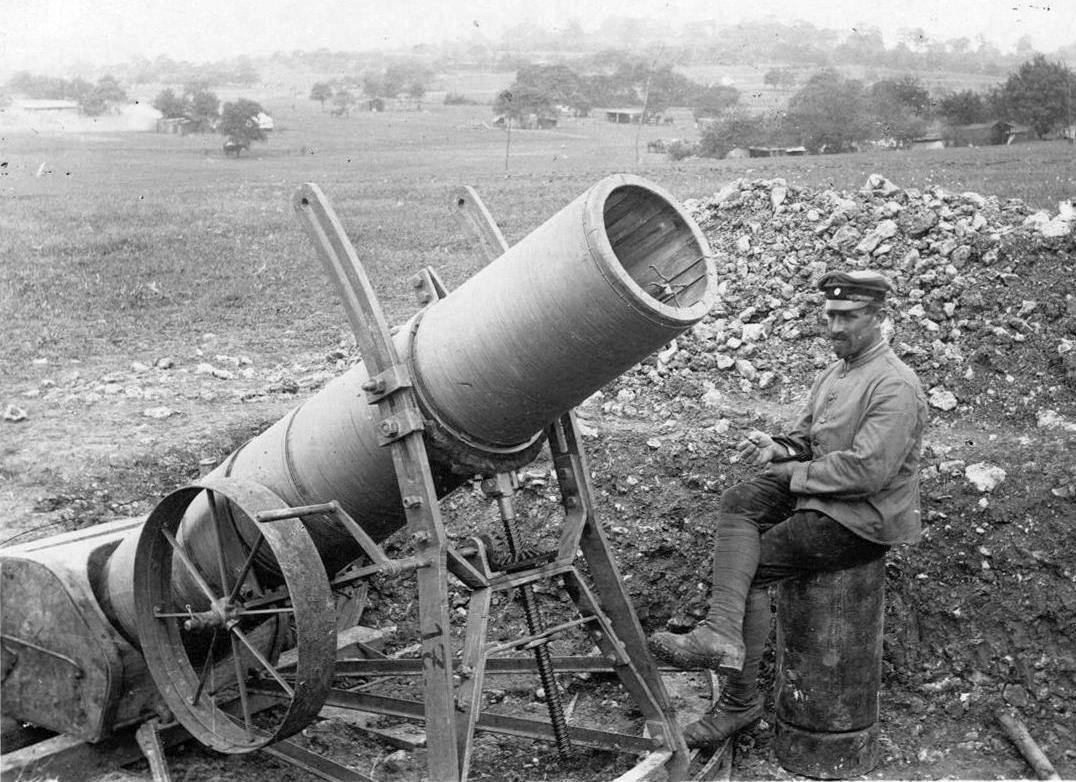 В конце концов стало не хватать взрывчатых веществ в отдельных местах. В смысле обычных взрывчатых веществ. Нужно было что-то думать. Вот вы в детстве с «карбидом» развлекались? (Это я к мужикам постарше…). Так вот. Вы были совсем не первыми с этой идеей. Были люди, которые это делали на самом высоком профессиональном уровне. Служили они в итальянской армии и с помощью вот таких жутковатых ацетиленовых устройств запускали мины на расстояние до 150 метров: