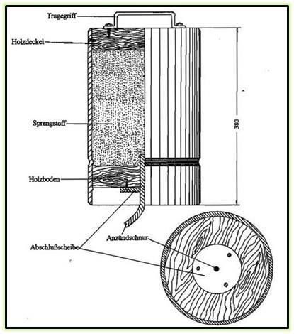 Но немцы не были бы немцами, если бы не смогли своих коллег переплюнуть в оригинальности с экономией. Познакомившись на себе с французскими и английскими изделиями, они захотели такие же, но лучше. Но время уже было такое, что всё железо потратили на всякие «Колосали». Нужно было как-то экономнее. Вот чем заменить сталь в таком случае? Правильно – деревом! Приглашаем плотников, которые специализируются на пивных бочонках, и они делают вот такие бомбы: