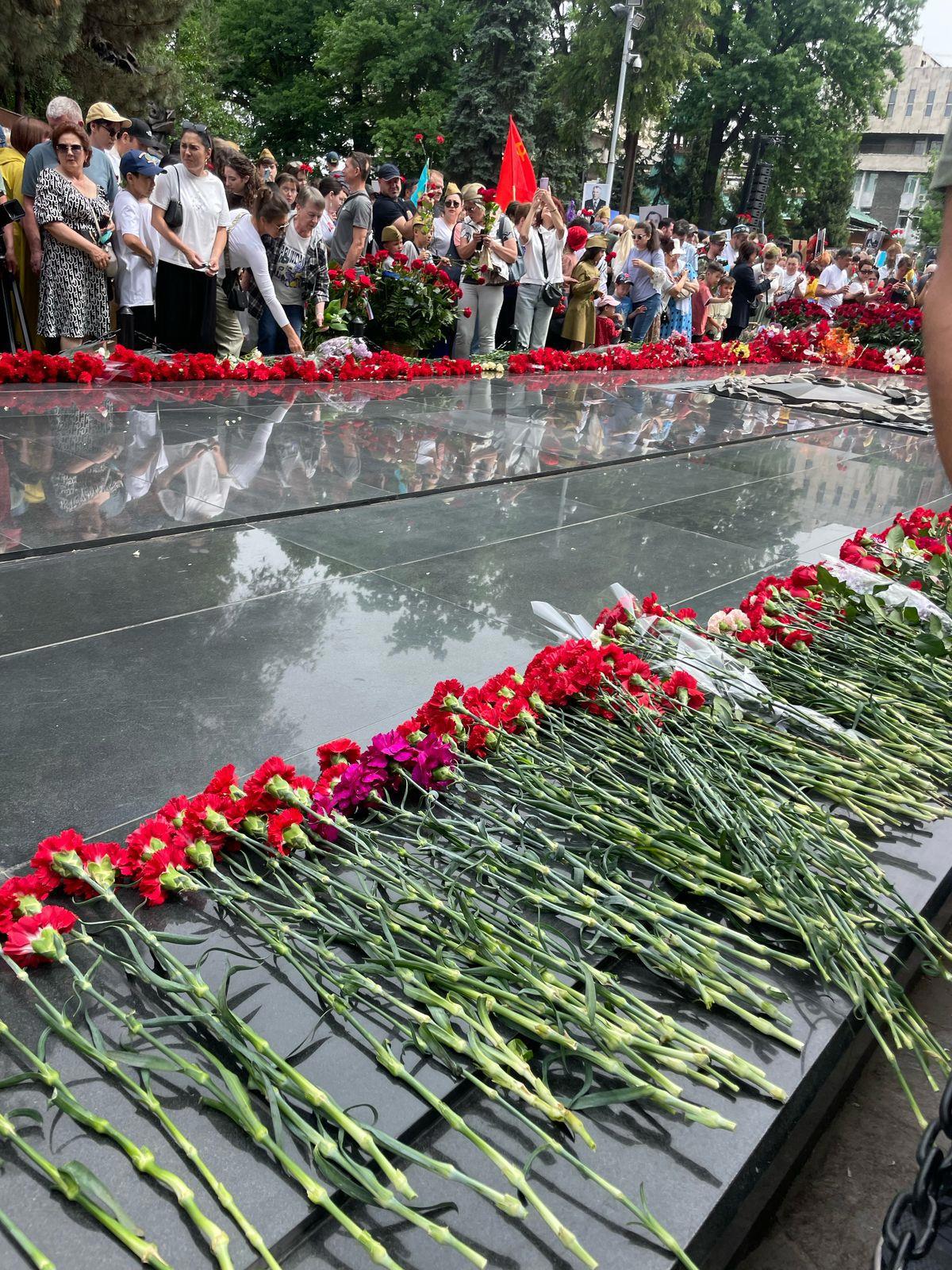 Вот несколько фото сделанных, когда мы там были. Это почётный караул в парке 28 Гвардейцев-Панфиловцев в Алматы несколько дней назад, а сегодня там много народу. Прошло шествие "Поклонимся героям" это аналог "Бессмертного полка".