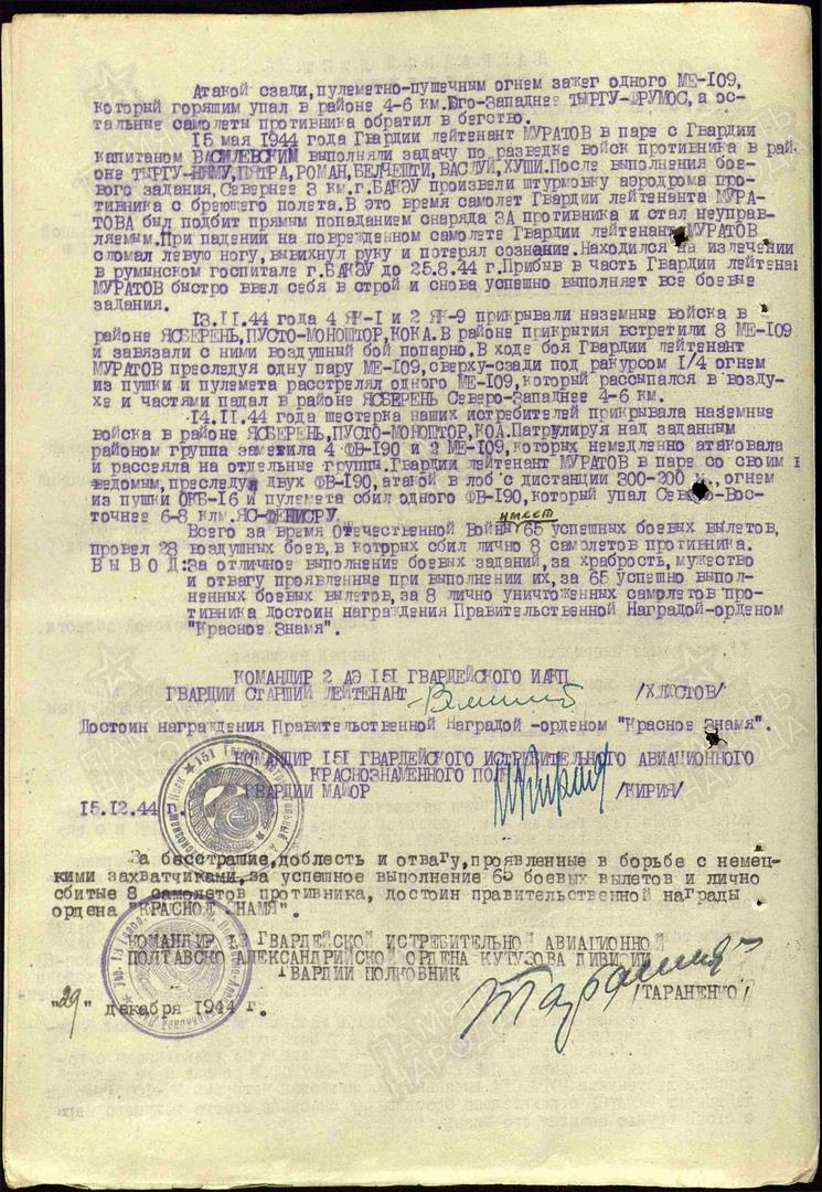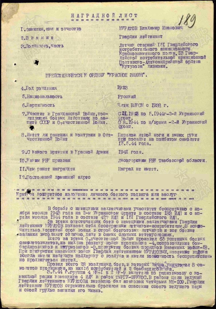 Наградной лист на Муратова.