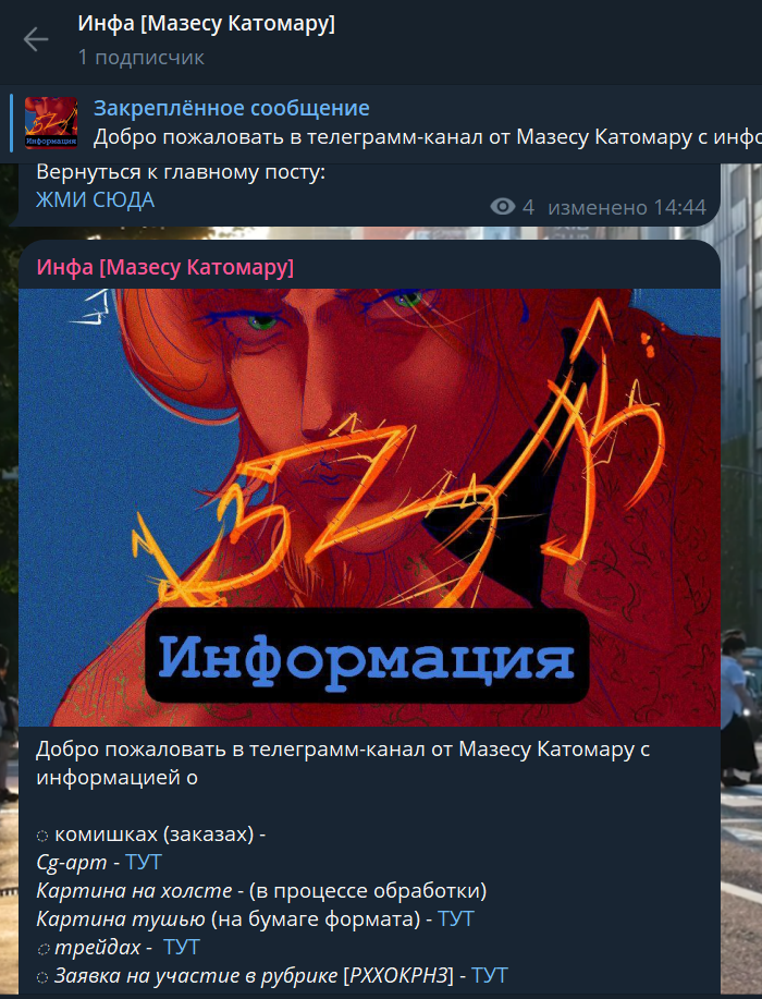 Автор: Мазесу КатомаруДоступна информация о ценах и предоставляемых услугах в телеграмм канале.
