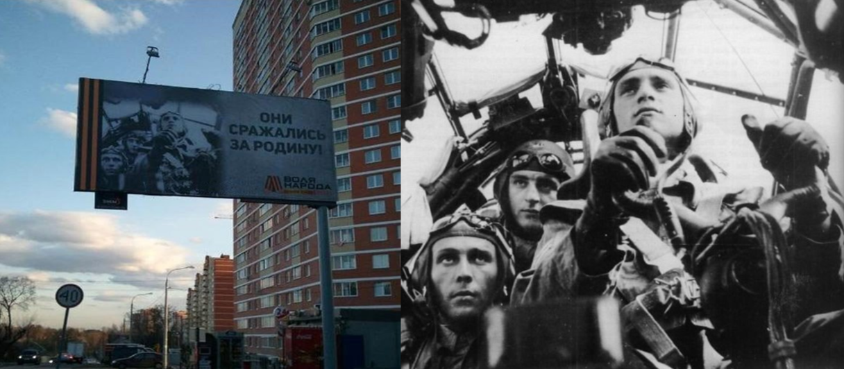"Они сражались за Родину" выглядит на билборде замечательно. И не поспоришь, только героями баннера, сражавшимися за родину оказались немецкие летчики бомбардировщика Ju-88 и сражались они за Германский Рейх.