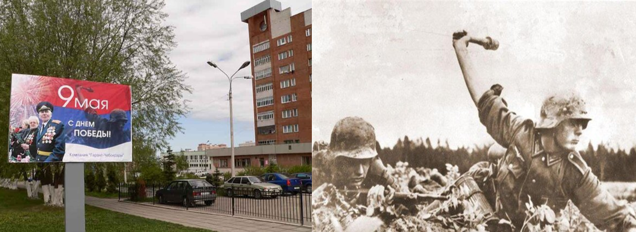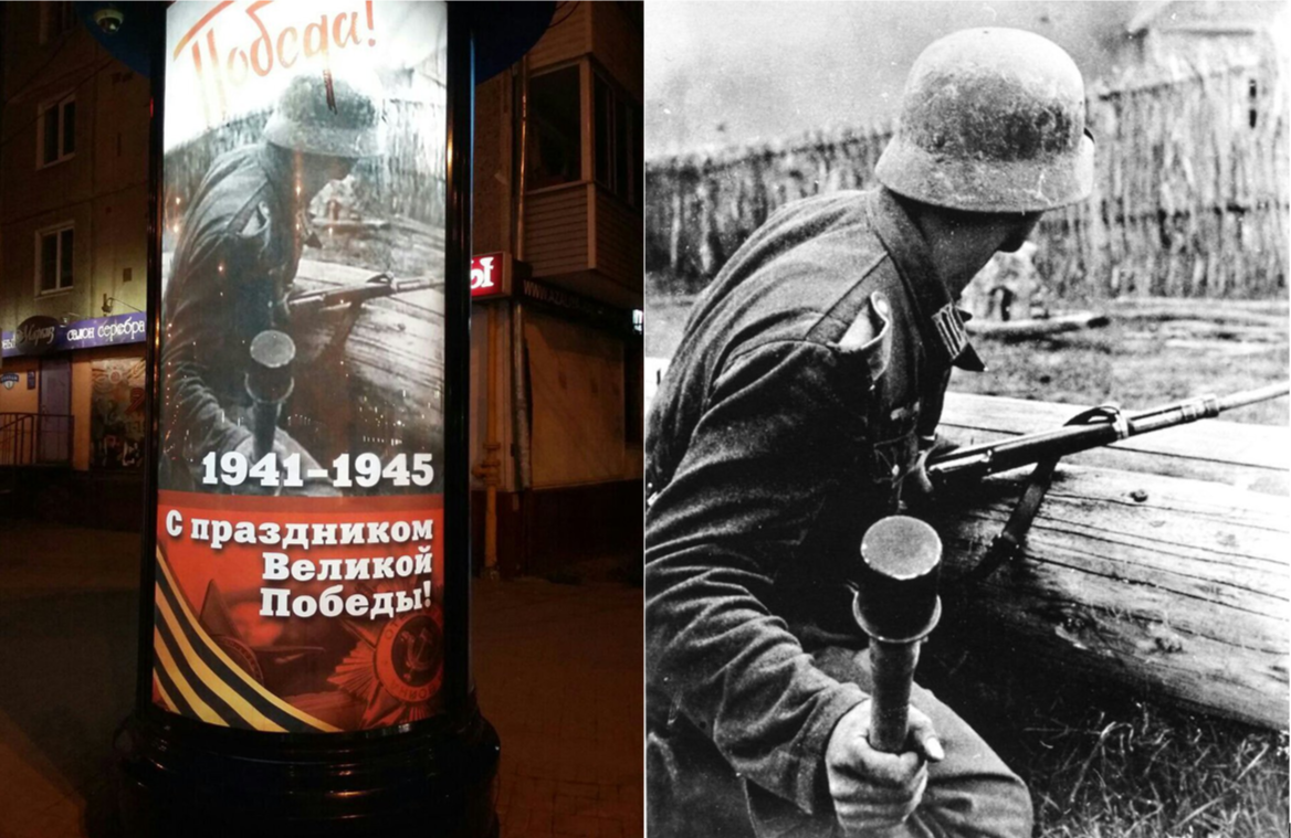 А тут вообще всё прекрасно! Мало того флаг России на билборде к верху ногами расположен, так еще и германский солдат гранату метает! А справа, оригинальное фото с немцем.