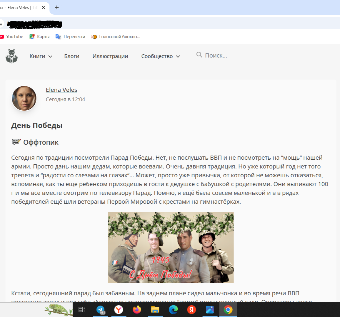 Нет, я вполне представляю, что дама - автор блога, не делала это поздравление "С Днём Победы" сама, а слизала откуда то из интернета. Но... как говорил Лис в "Маленьком принце" у Антуана де Сент-Экзюпери: «Мы в ответе за тех, кого приручили».