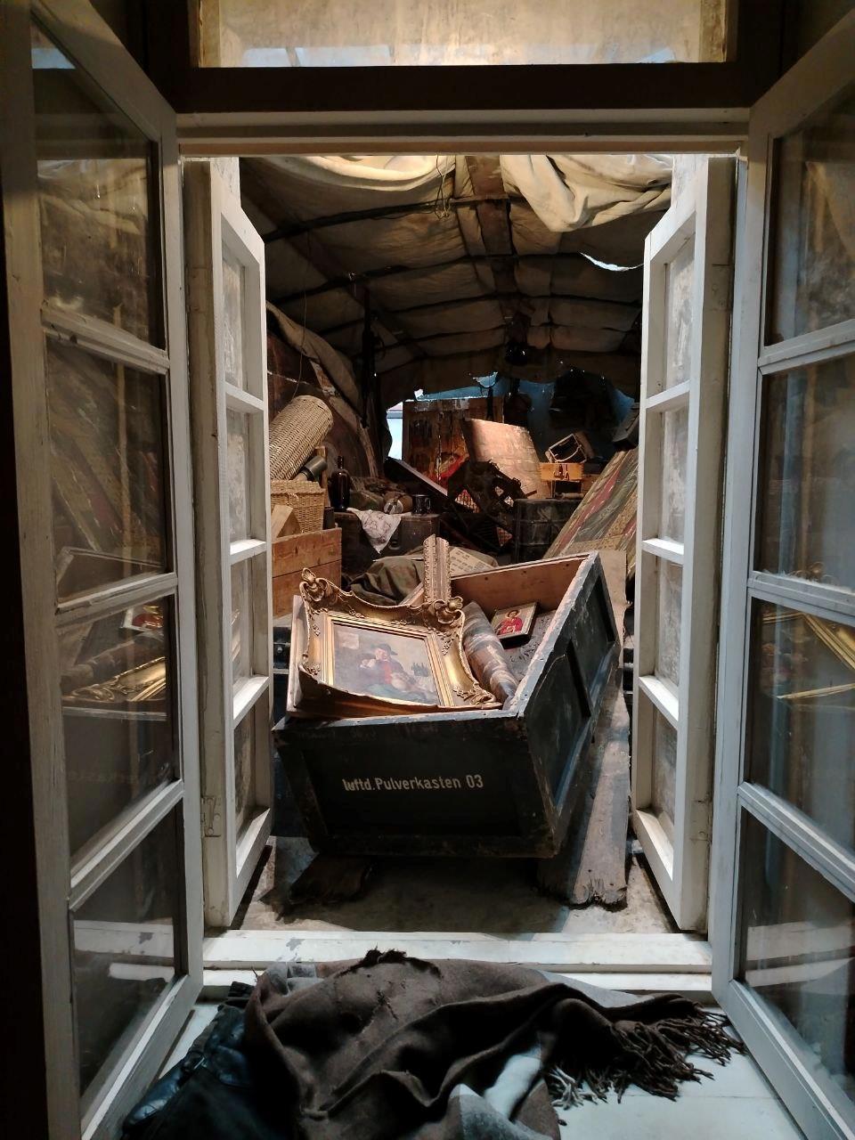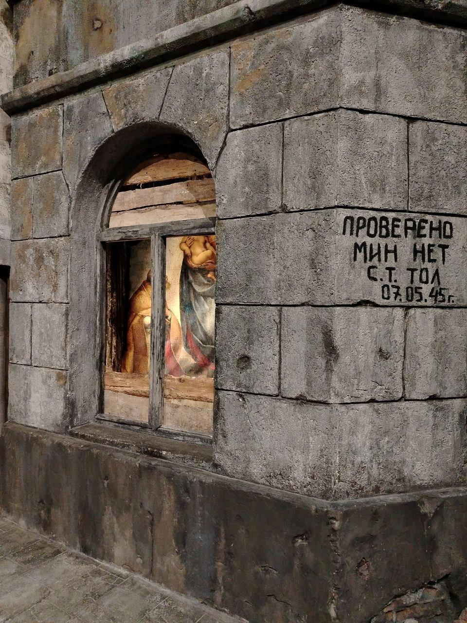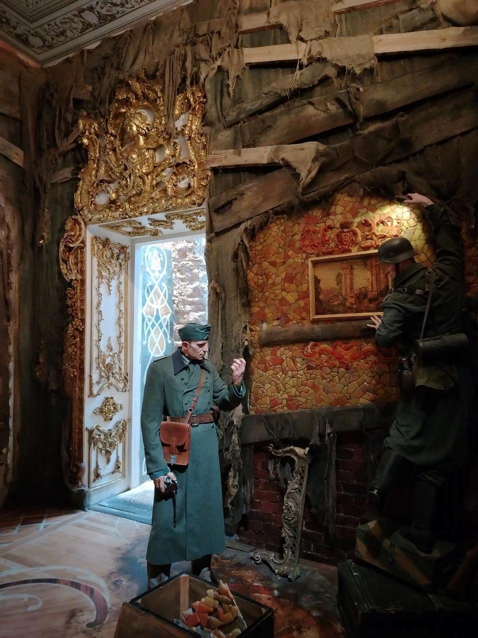Вокруг строения того времени. На первом фото на первом этаже за картиной - партизанская радиостанция. Далее - немцы вывозят Янтарную комнату, следом - фургон, куда они скидывают награбленные произведения искусства, чтобы вывезти в Германию. Кстати, это тоже "ниша", в которую заглядываешь.