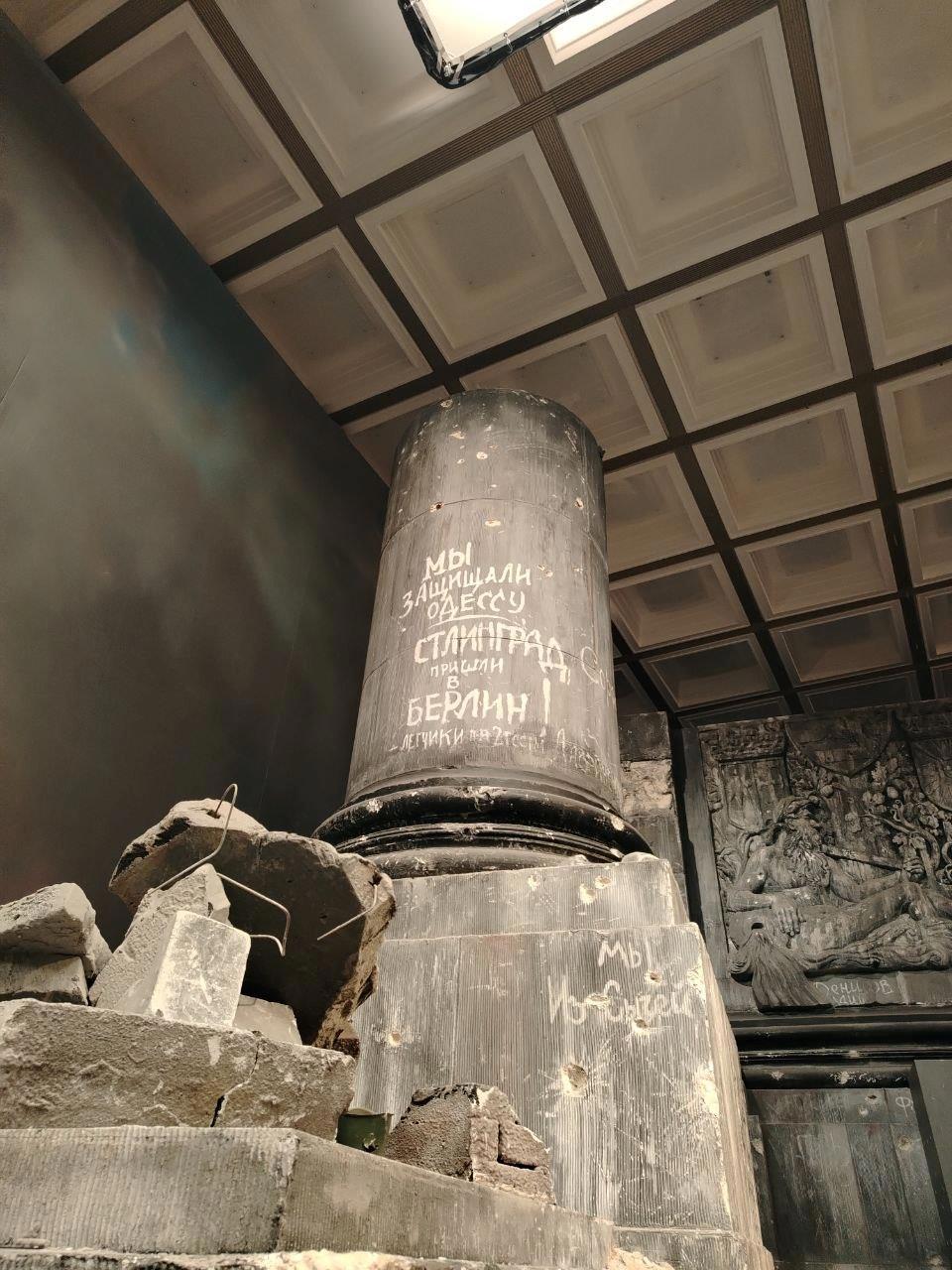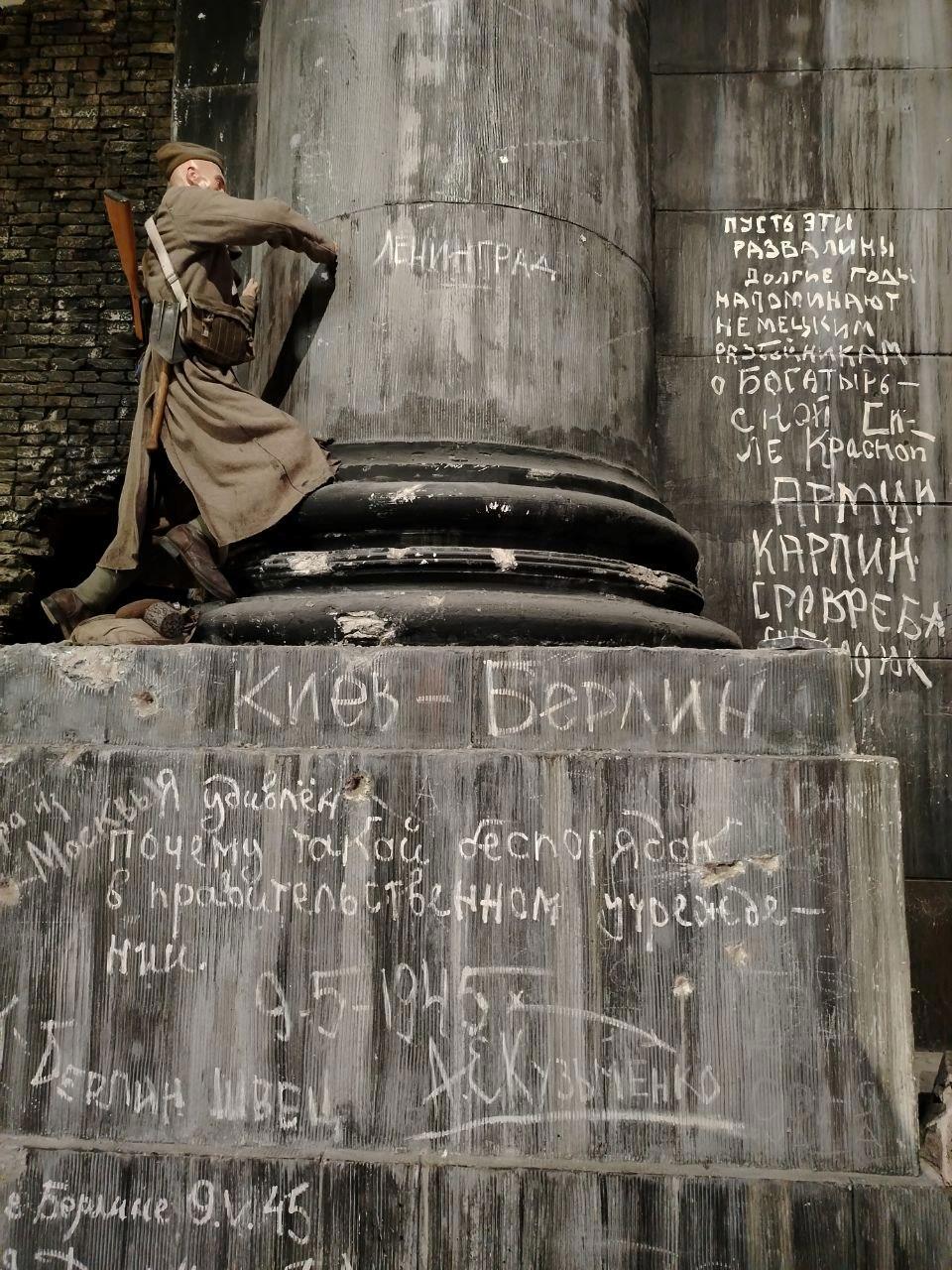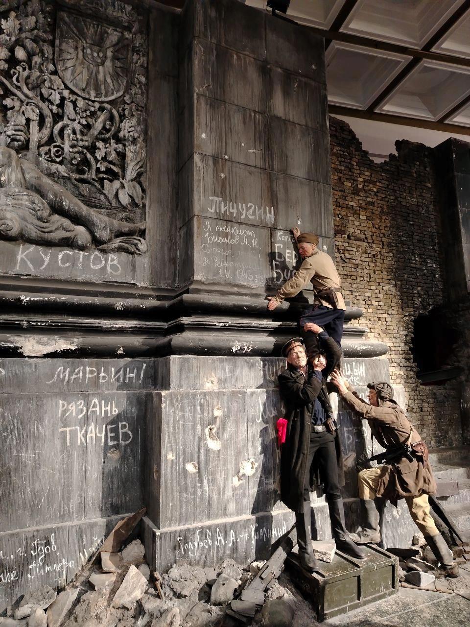 И вот через разбитый проем вместе со штурмовой группой советских солдат мы оказываемся в зале штурма Рейхстага! В конце экспозиции бойцы оставляют надписи на его стенах и колоннах. Победа!
