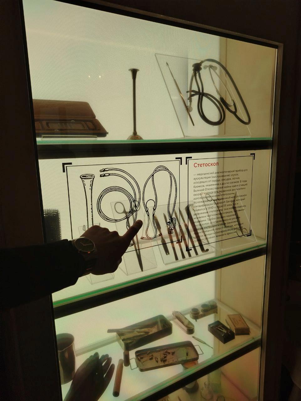 Далее зал эвакуации и потом - зал технических достижений. А за ним - медицина. Кстати - если вы подойдете к любому шкафу - то стекло на нем - сенсорное. И мы можете прямо на него вывести информацию об экспонатах - они все равно останутся видны вам. Двигатели самолетов, конвейеры - экскурсовод все запускает при вас.