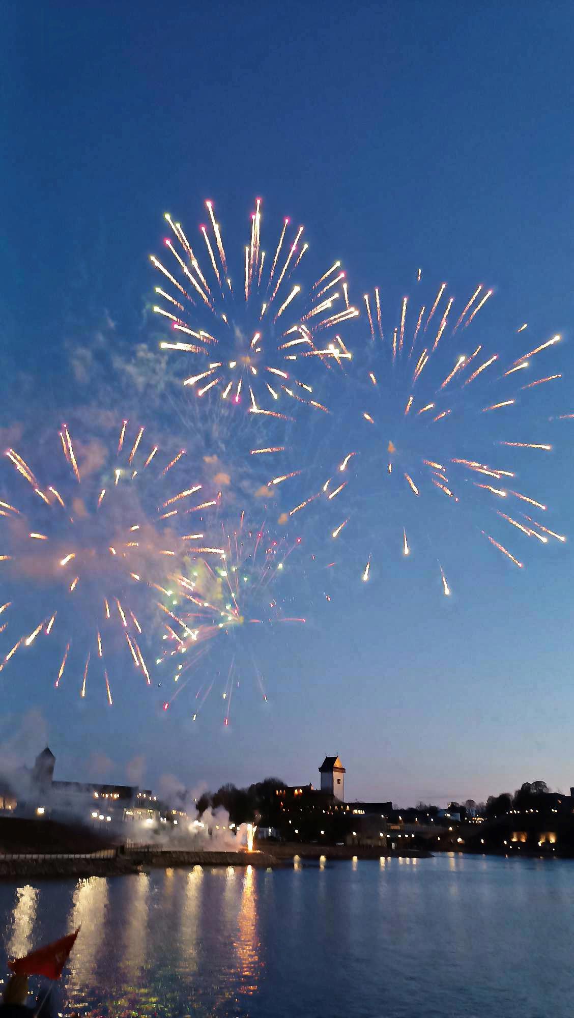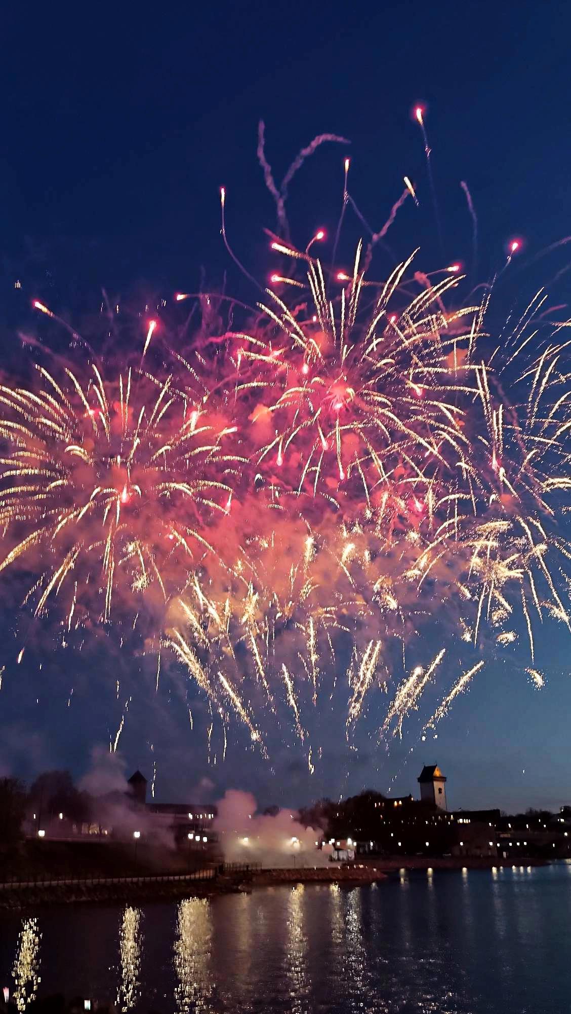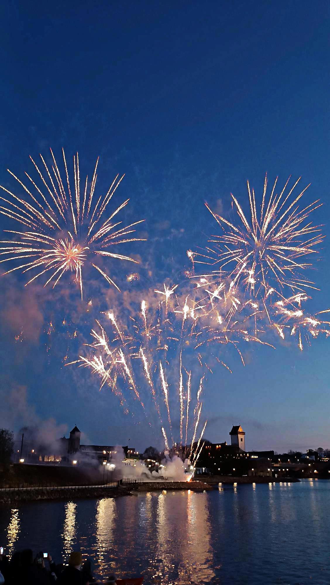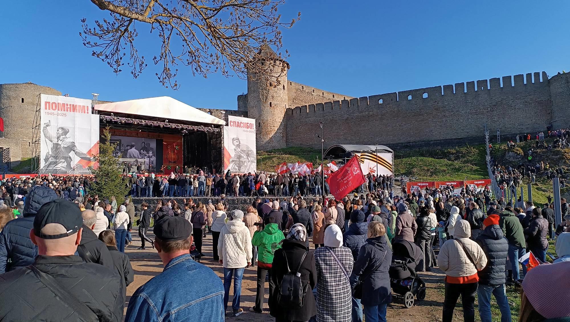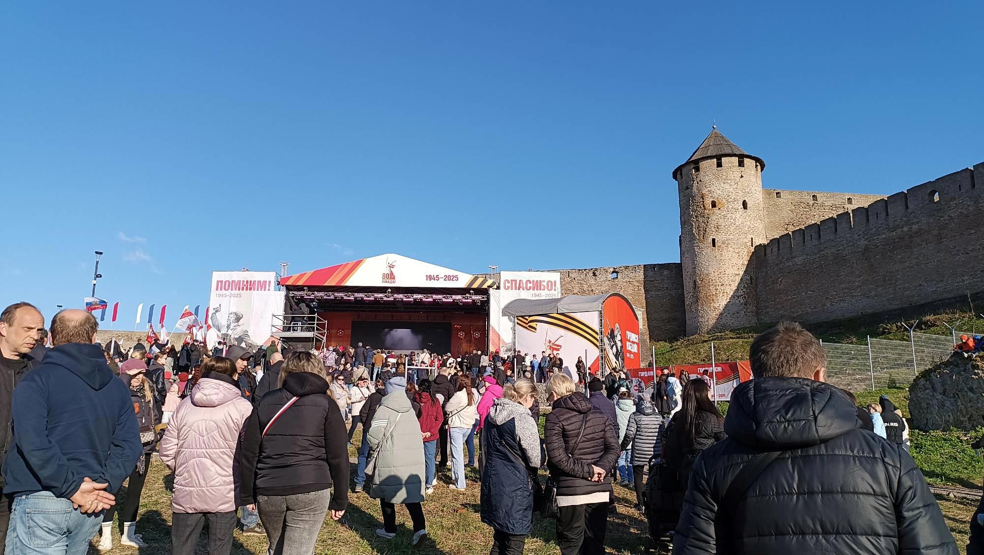 Вчера, 9 мая , мы отмечали День Победы. На берегу реки, под стенами Ивангородской крепости состоялся концерт - сценой на ту сторону реки, который с помощью больших экранов и весьма громкого звука транслировался на ту сторону, где на променаде собралось едва лине больше людей, чем на ивангородской стороне. А позже вечером был салют над рекой. Мы смотрели его на нашей стороне, а эстоноземельцы - на своей. И всё это время мы перемигивались фонариками своих телефонов. Некоторые звонили своим родственникам по ту сторону реки. А потом мы все всесте кричали "Рос-си-я!". Они тоже. Хотя за "проявление эмоций" полагался штраф в 2400 евро или задержание на сутки, с последующим возбуждением уголовного дела.