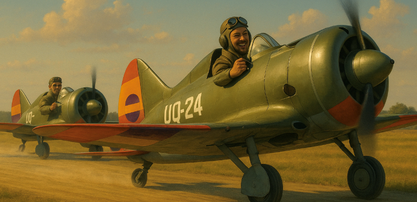 Попросил тут девушку-дизайнера нарисовать Лёху в кабине И-16, катящимся по полю, следом за ним, в отдалении еще один самолет...
