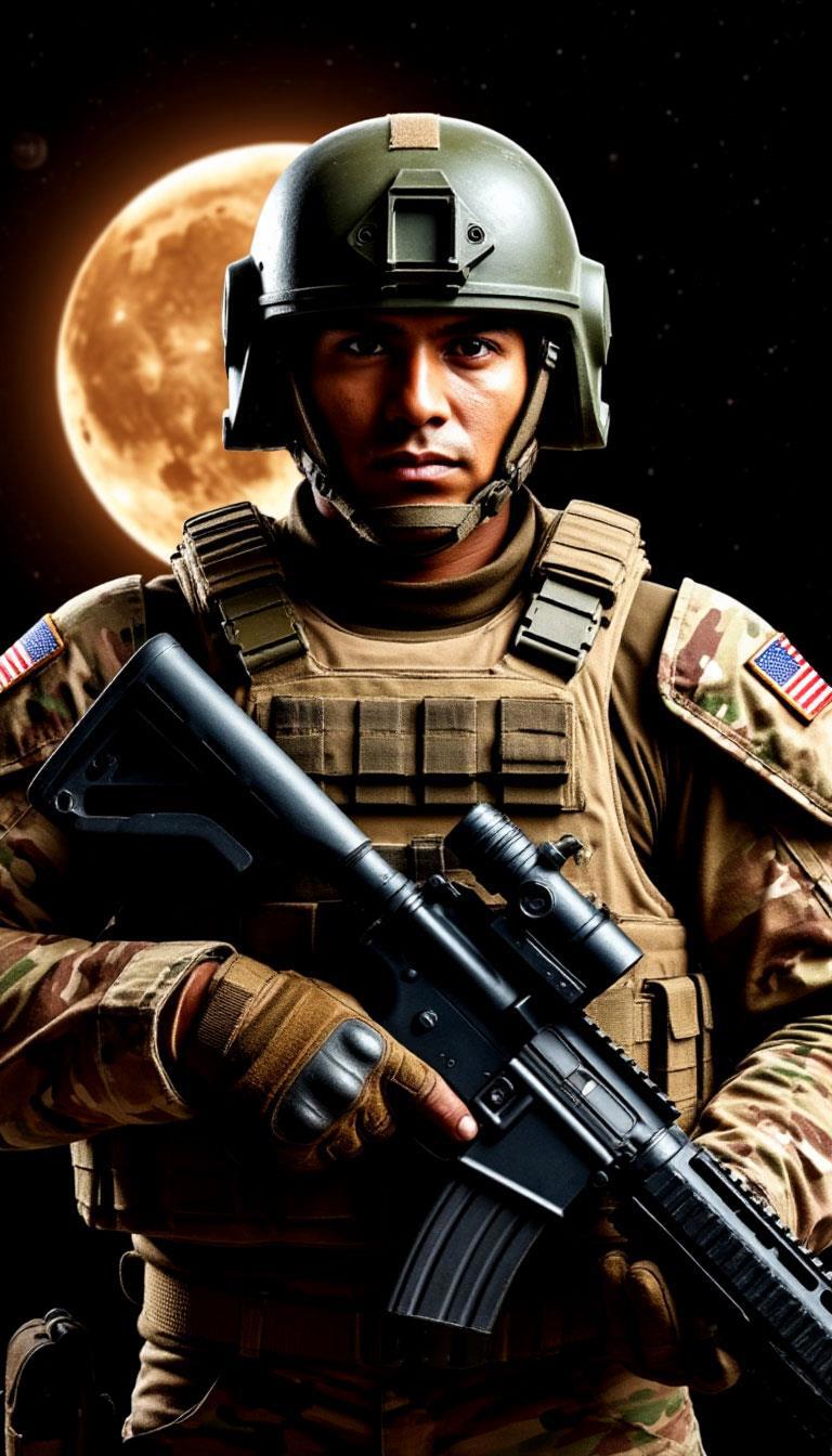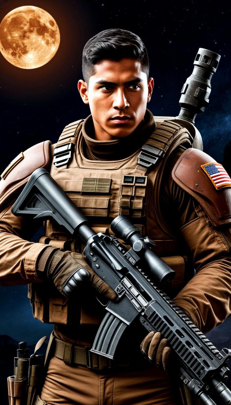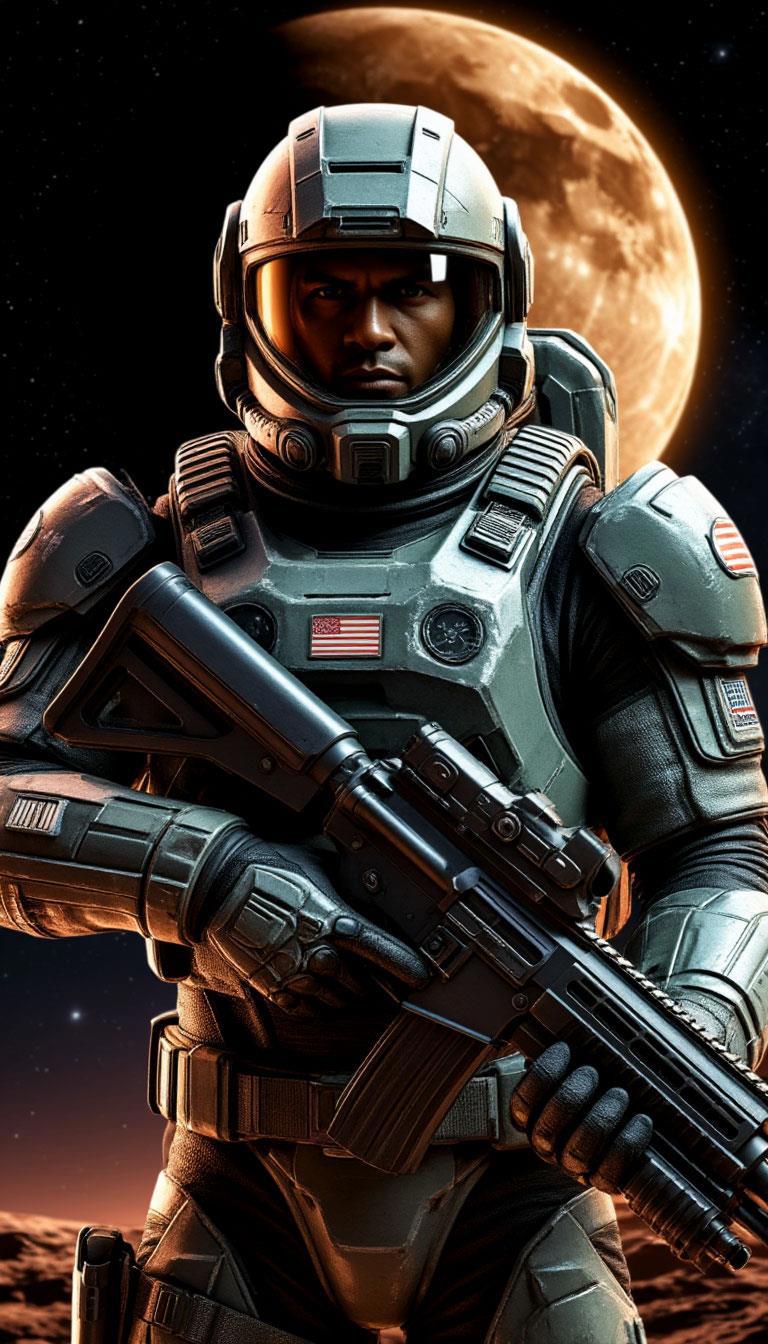 Автор: Кусков Сергей АнатольевичЗадача: "парень латиноамериканец в броне космической пехоты с бластером в руке, фон тёмный, сзади него планета Венера"