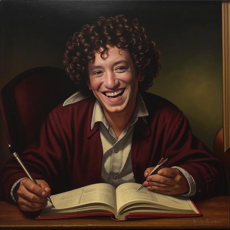 Автор: Ева МустоненДрузья, решила я тут на Трибуну АТ податься, ну и попросила ИИ нарисовать мне на удачу что-то литературно-ободряющее. Или кого-то. Например, радостного Пушкина. Пусть, говорю, одним только взглядом прямо вот вдвойне заряжает меня оптимизмом. И… вуаля! Готов мой дважды вдохновитель: знакомьтесь — Пушкин-амбидекстр, со странным воротником и не менее странными пальцами, больше смахивающий на юного Леонтьева, который явно собрался что-то дописать сразу на двух страницах!