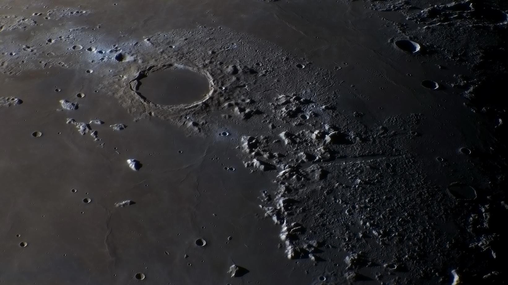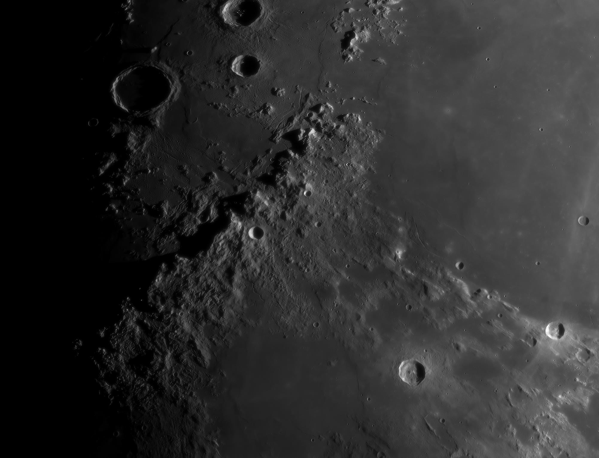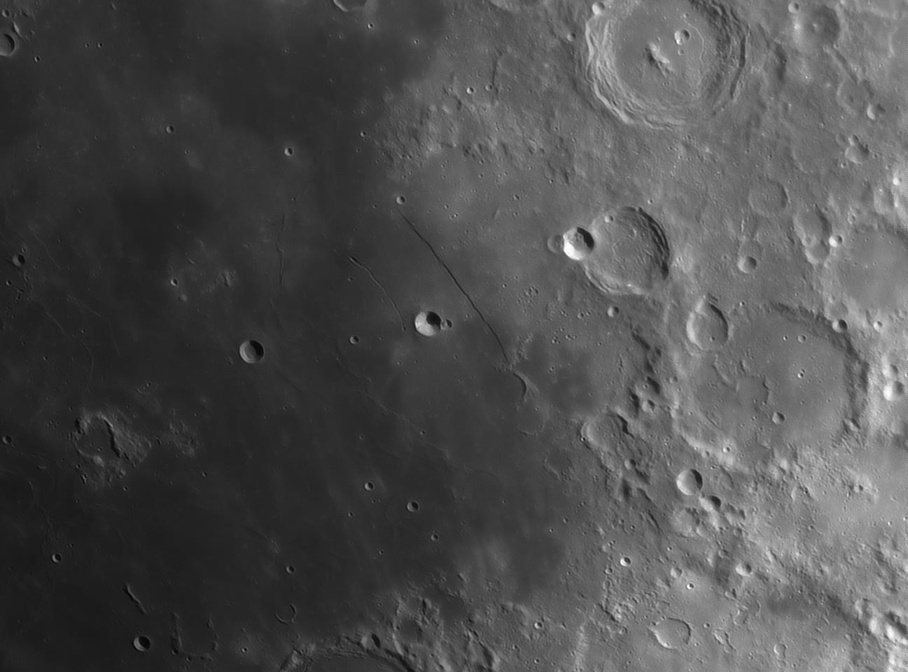 Почти посередине следующего снимка -- Прямая стена. Это сброс длиной до 120 км и высотой от 200 до 500 м. Левее -- слегка изогнутый разлом Rima Birt длиной 50 км: