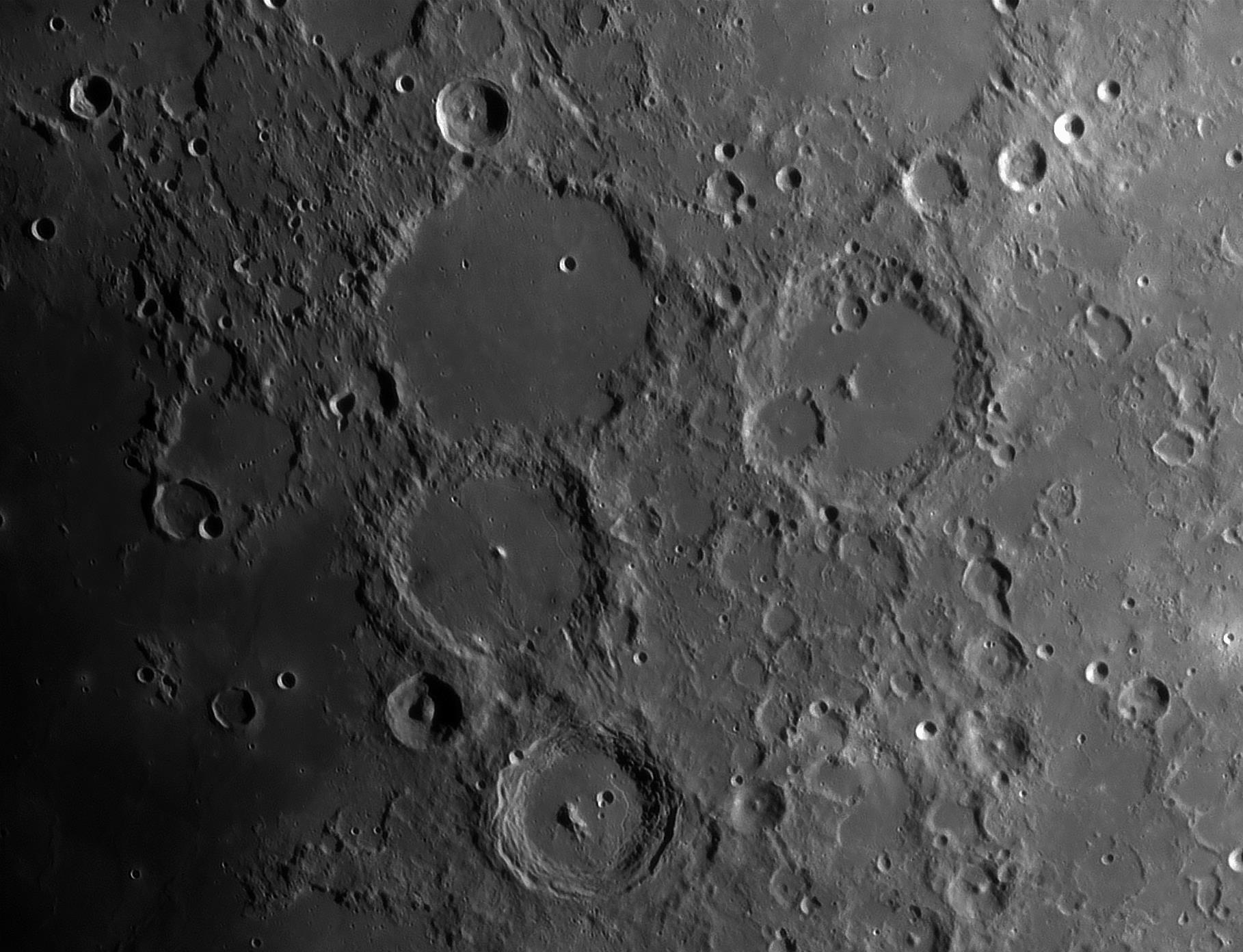 Вот вытянувшиеся в цепочку кратеры Птолемей (153 км), Альфонс (111 км) и Арзахель (97 км). Севернее Птолемея находится кратер Гершель (39 км), а слева от линии, соединяющей Альфонс и Арзахель, лежит кратер Аль-Битруджи (40 км) с очень крупным центральным пиком: