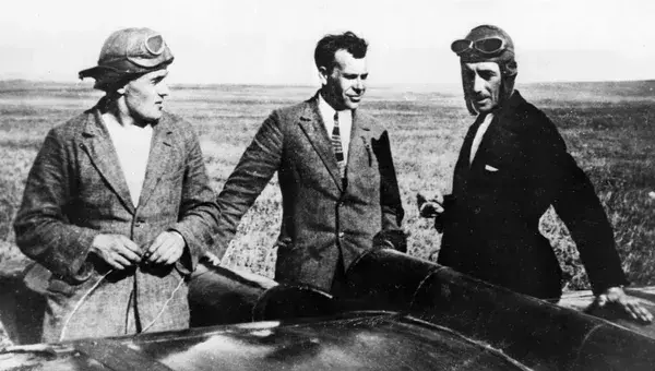 Сергей Люшин, Сергей Королёв (в планере), Константин Арцеулов на горе Узун-Сырт. Фото из интернета.