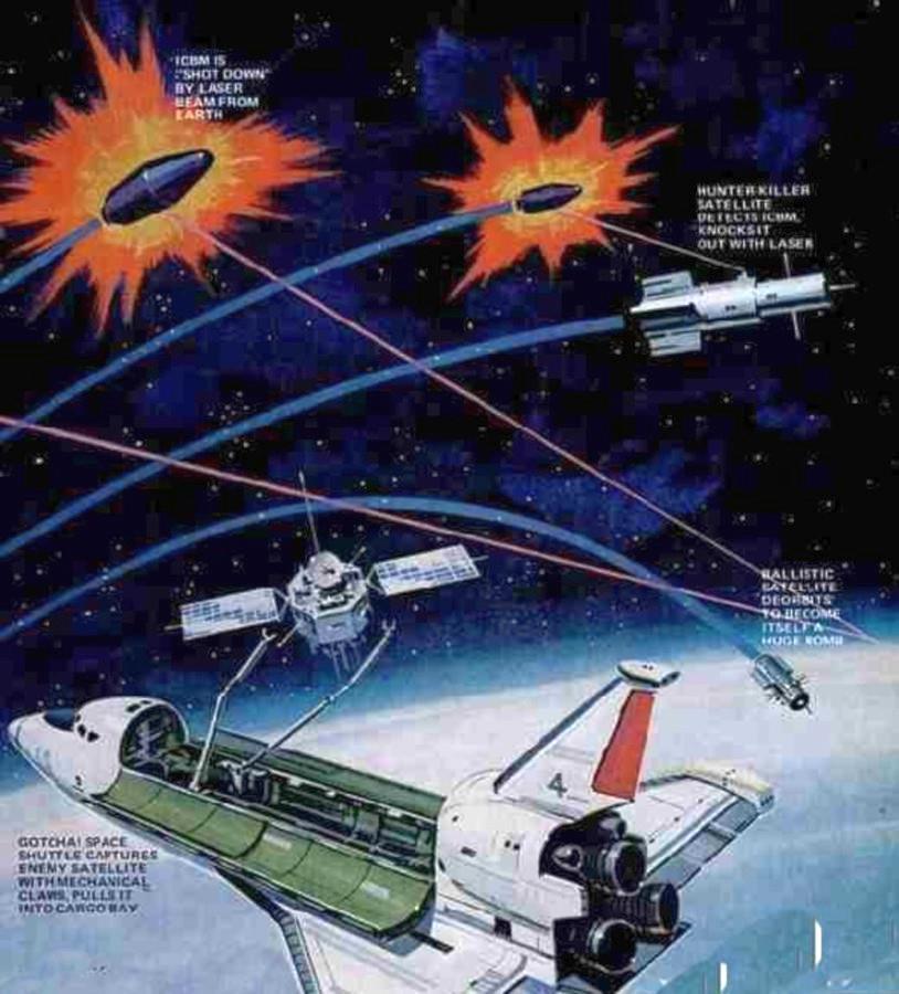 Потом ухватились за идею о дежурстве беспилотников с той же целью, припомнив, что когда-то полёты над Ираном им удавались. Ну так это когда было-то… Другими словами все эти идея не более, чем маниловщина. Вот тут и начались разговоры про новое космическое оружие. Картинки стали немного другими, хотя суть осталась прежней. Вот, кстати, одна из таких картинок: